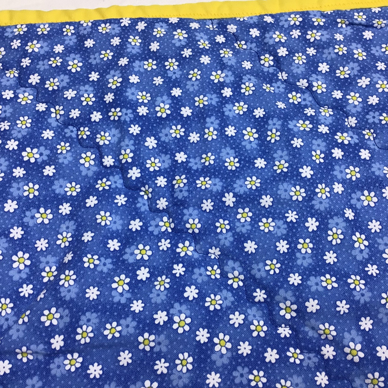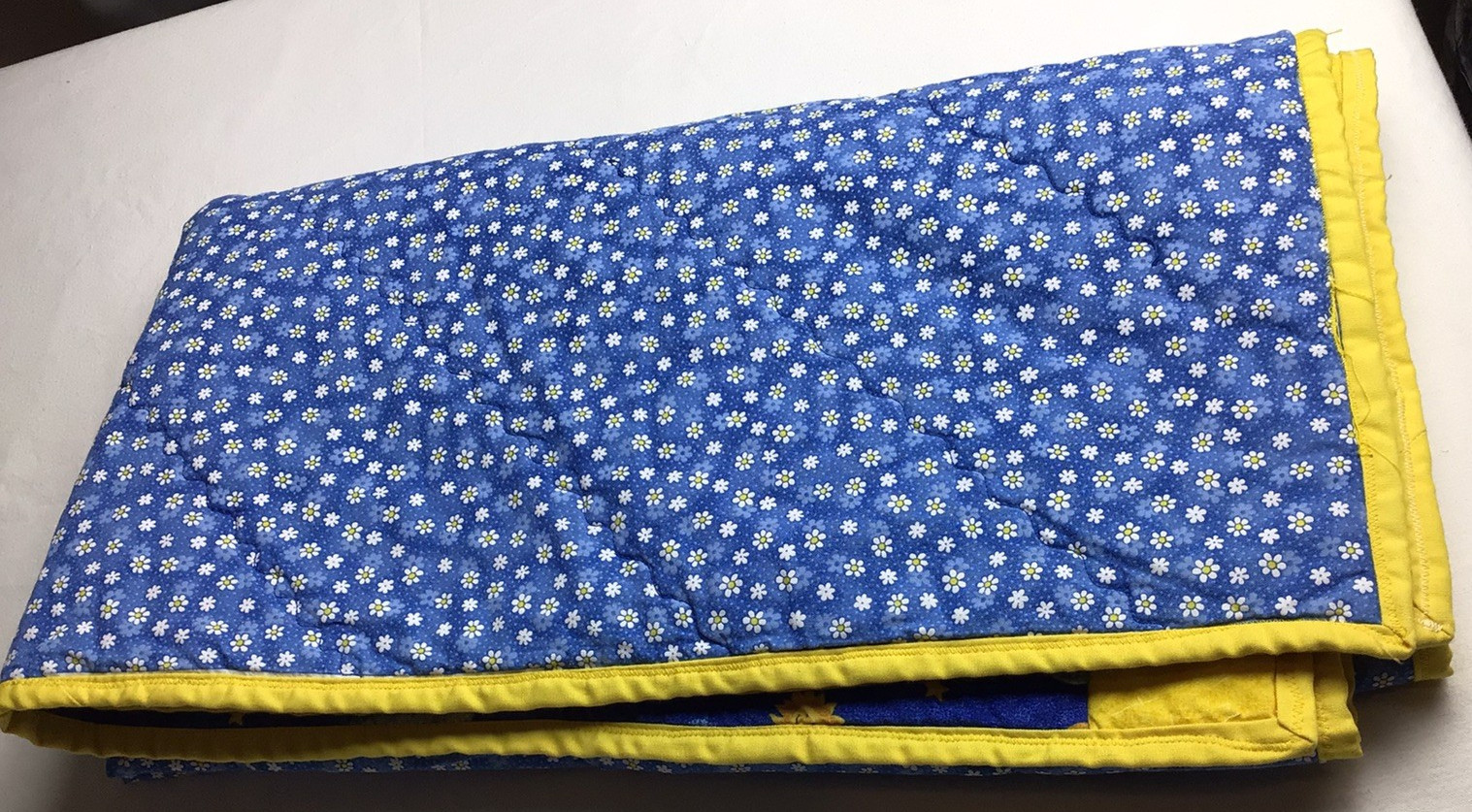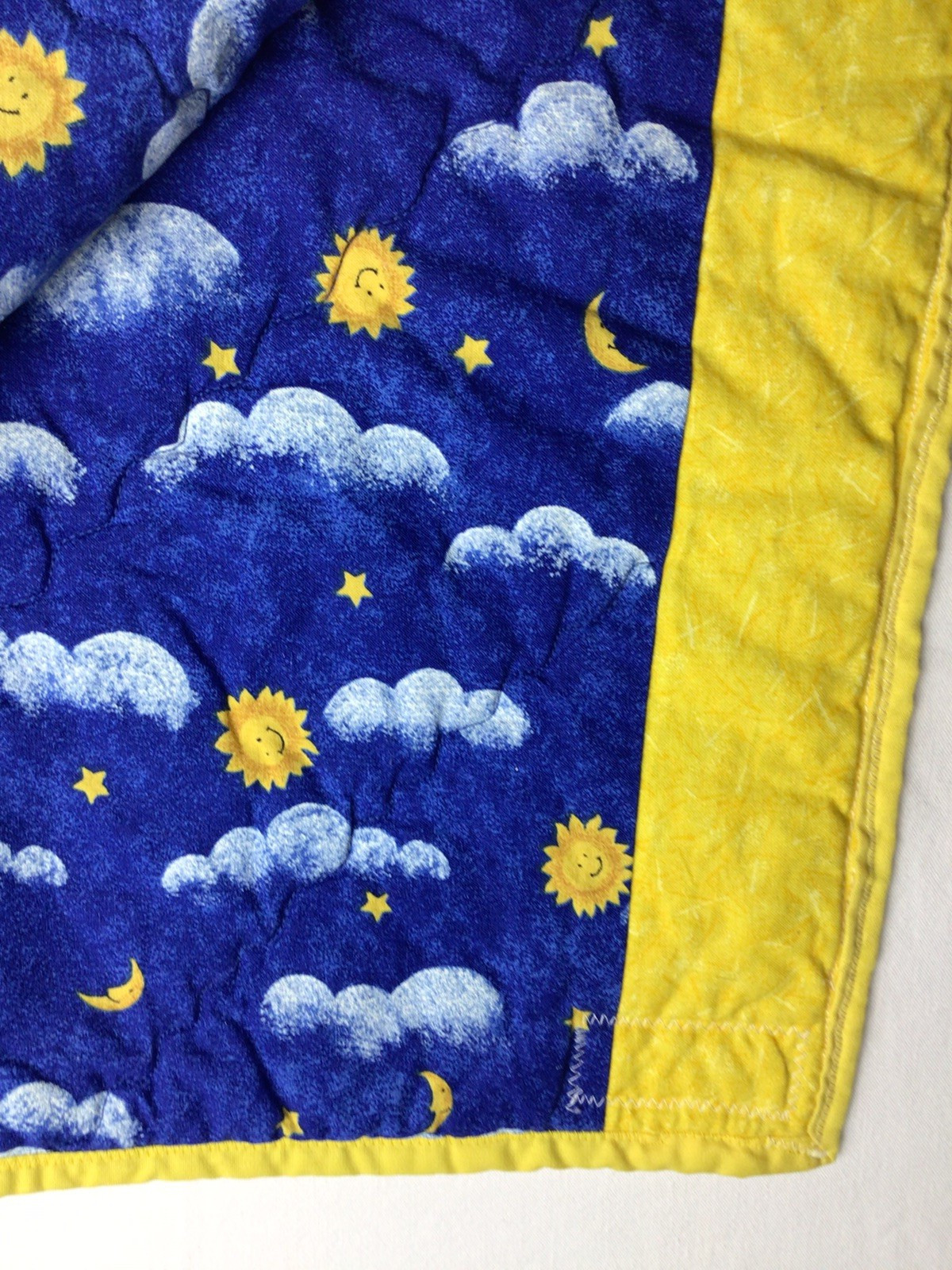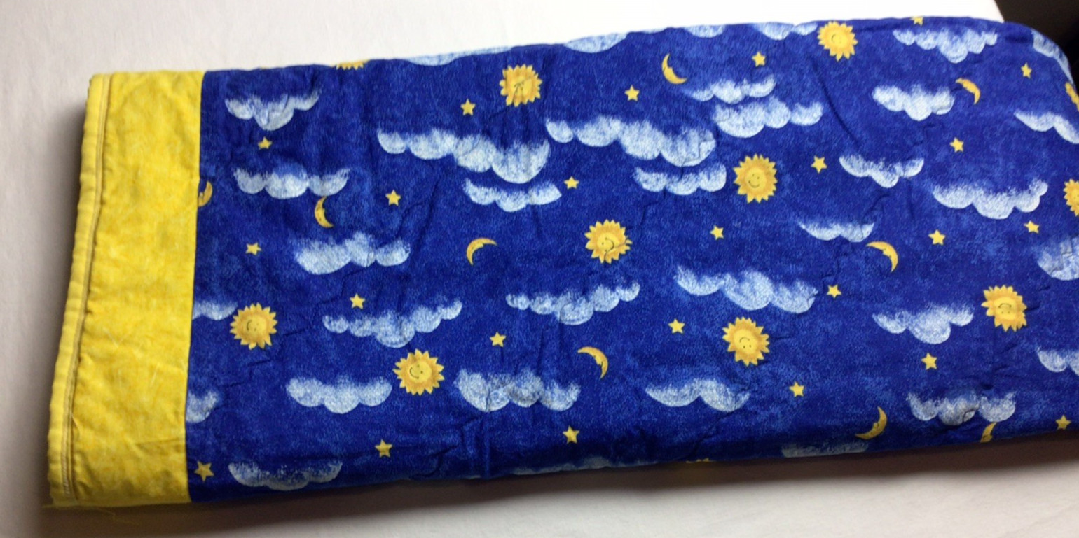 Baby Quilt Handmade Blue Yellow Sun clouds stars moon daisies Crib 36x42
