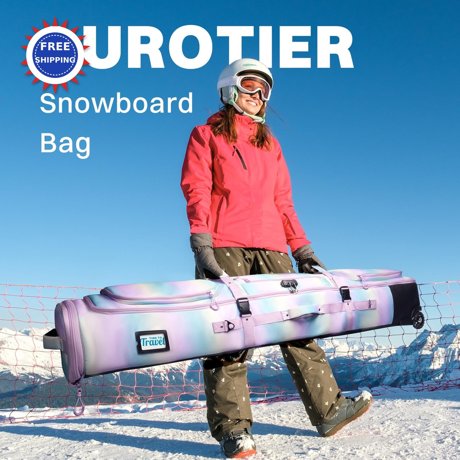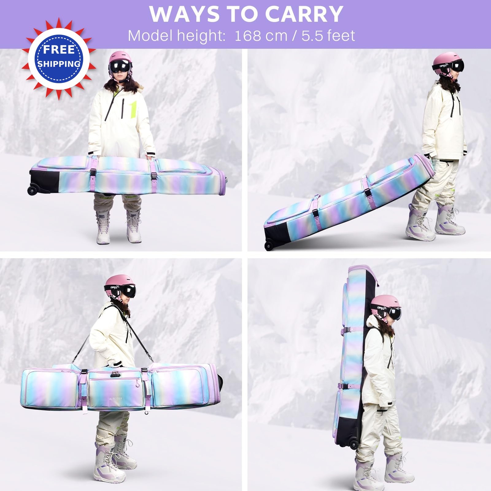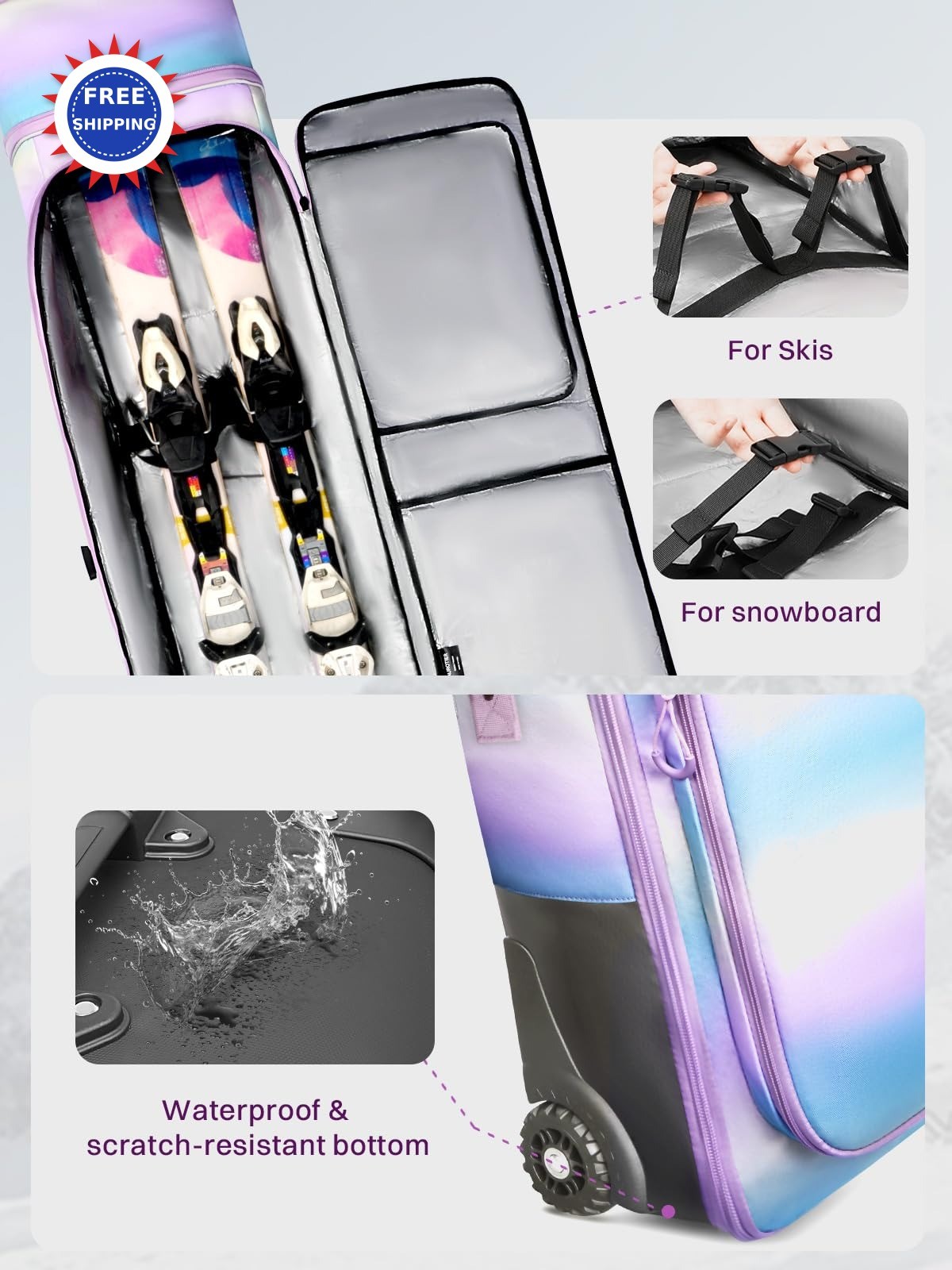 AUROTIER 10mm Padded Skis Snowboard Bag with Wheels and TSA Lock Blue pink