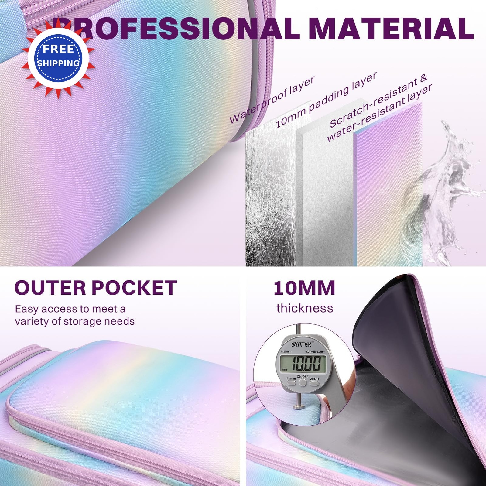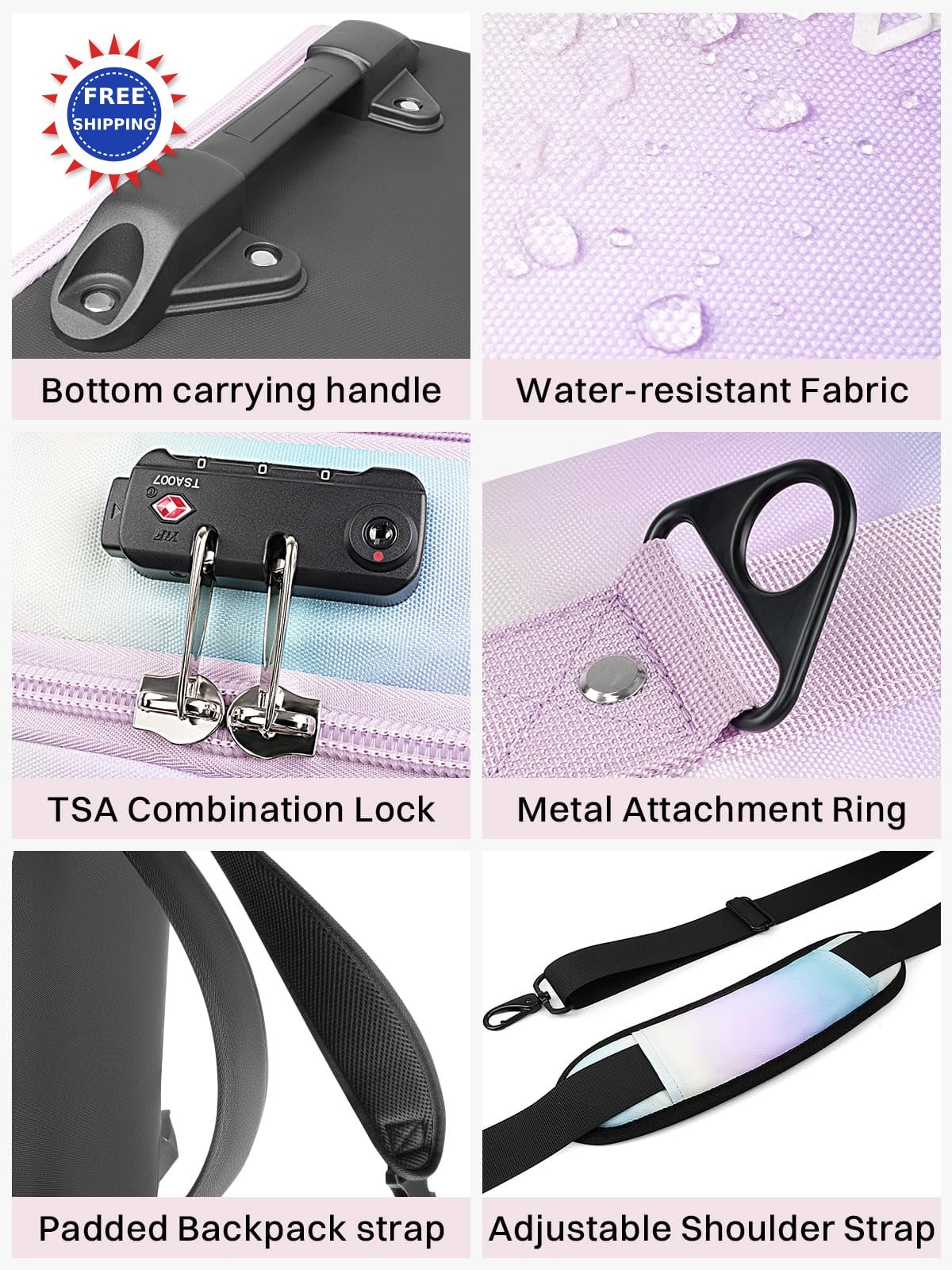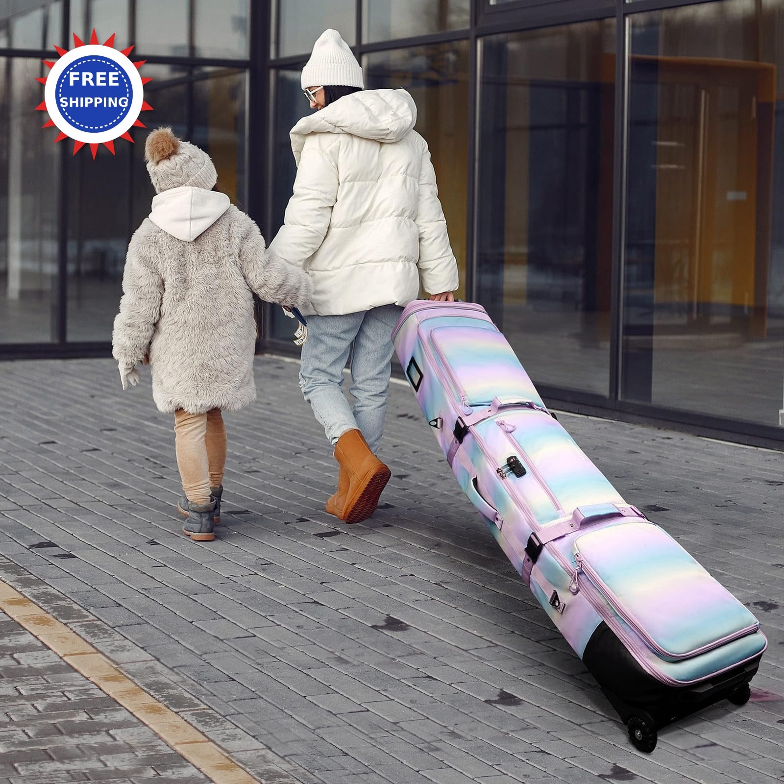 AUROTIER 10mm Padded Skis Snowboard Bag with Wheels and TSA Lock Blue pink
