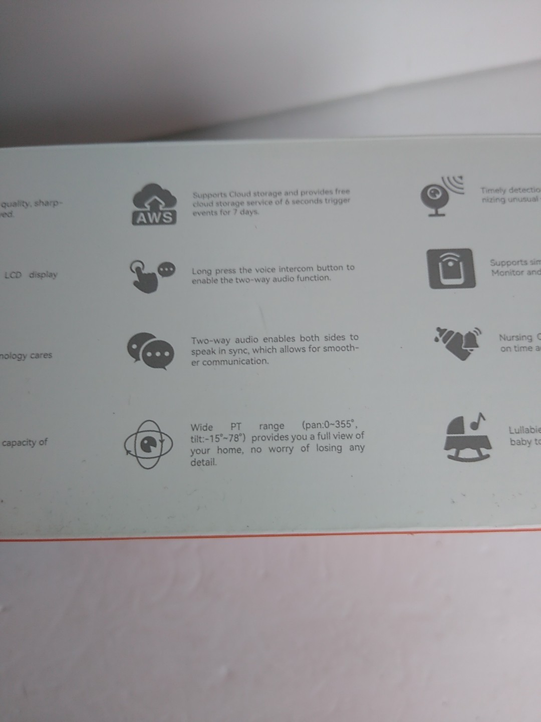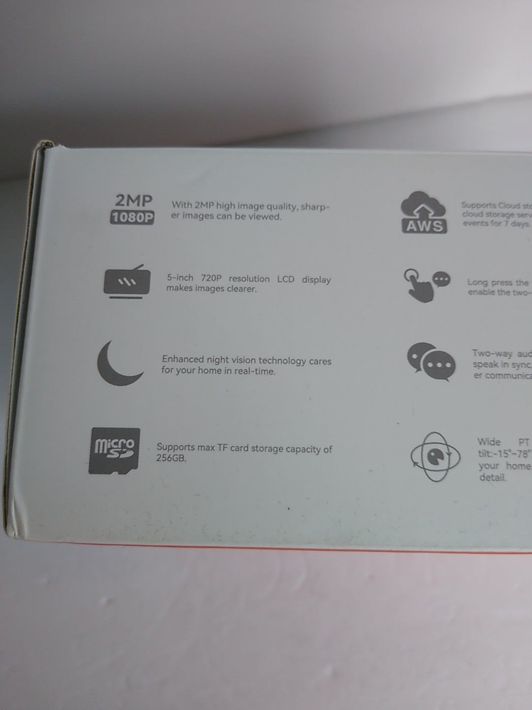 Особенности: Lullaby, Alexa & Google, Night Vision, Pan & Tilt, Sound Detection, 2 Way Audio, One Key Talk, Ai Motion Detction, Auto Tracking, SD Card & Cloud Storage, 1080P Full HD, 5" LCD Display, Temp Sensor, Take Photo, Record a Video, With or Without App Conection