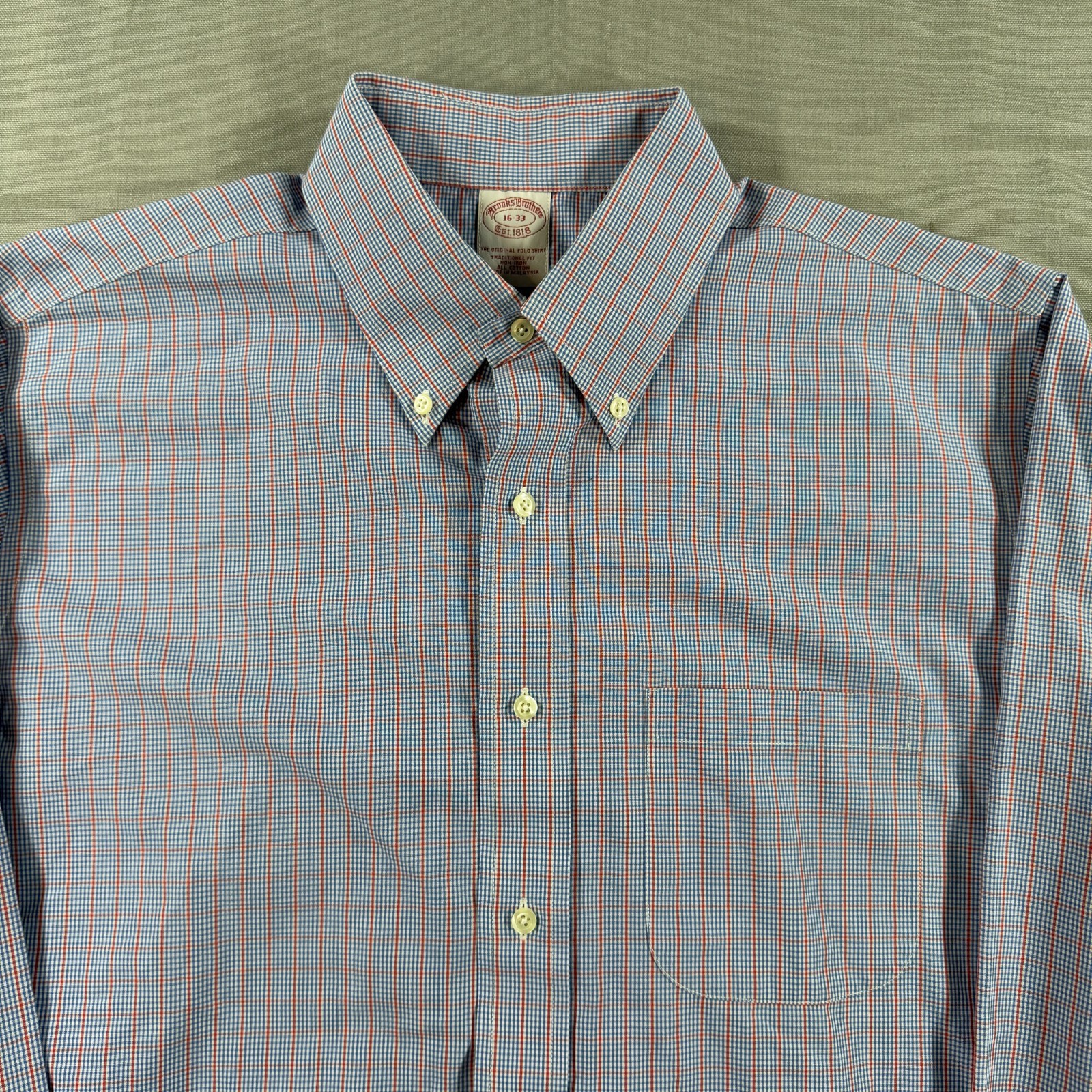 Brooks Brothers 1818 Non Iron Dress Shirt Mens 16 33 Blue Check Long Sleeve