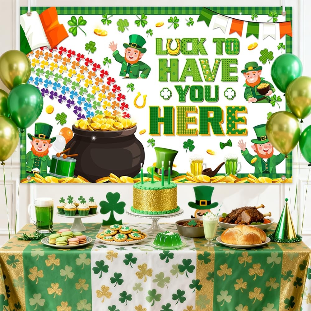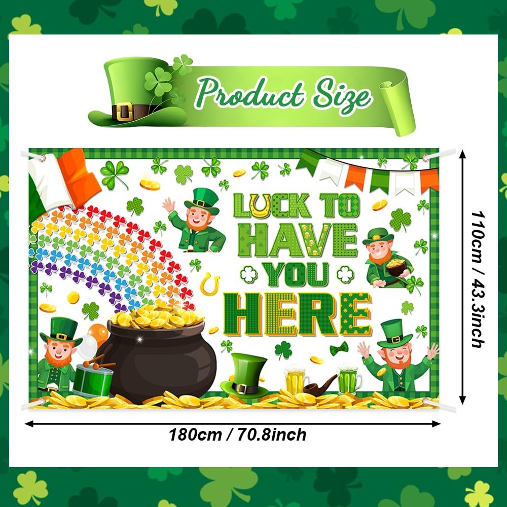 St Patricks Day Backdrop Banner Rainbow Gold Coins Green Shamrock Lucky Clov