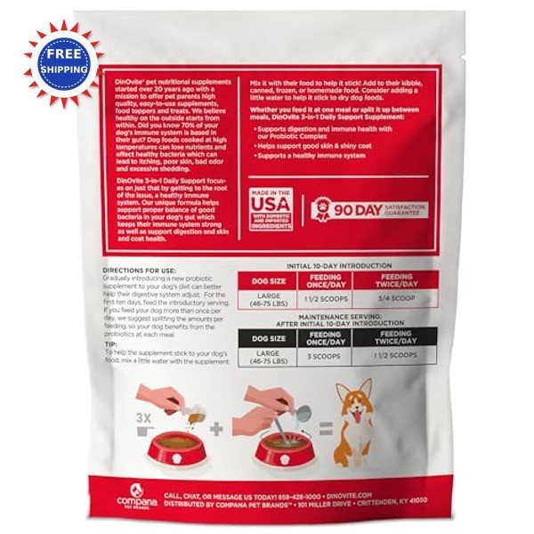 Dinovite Probiotic Supplement for Dogs Hot Spot Relief Skin Coat 90 Day Large