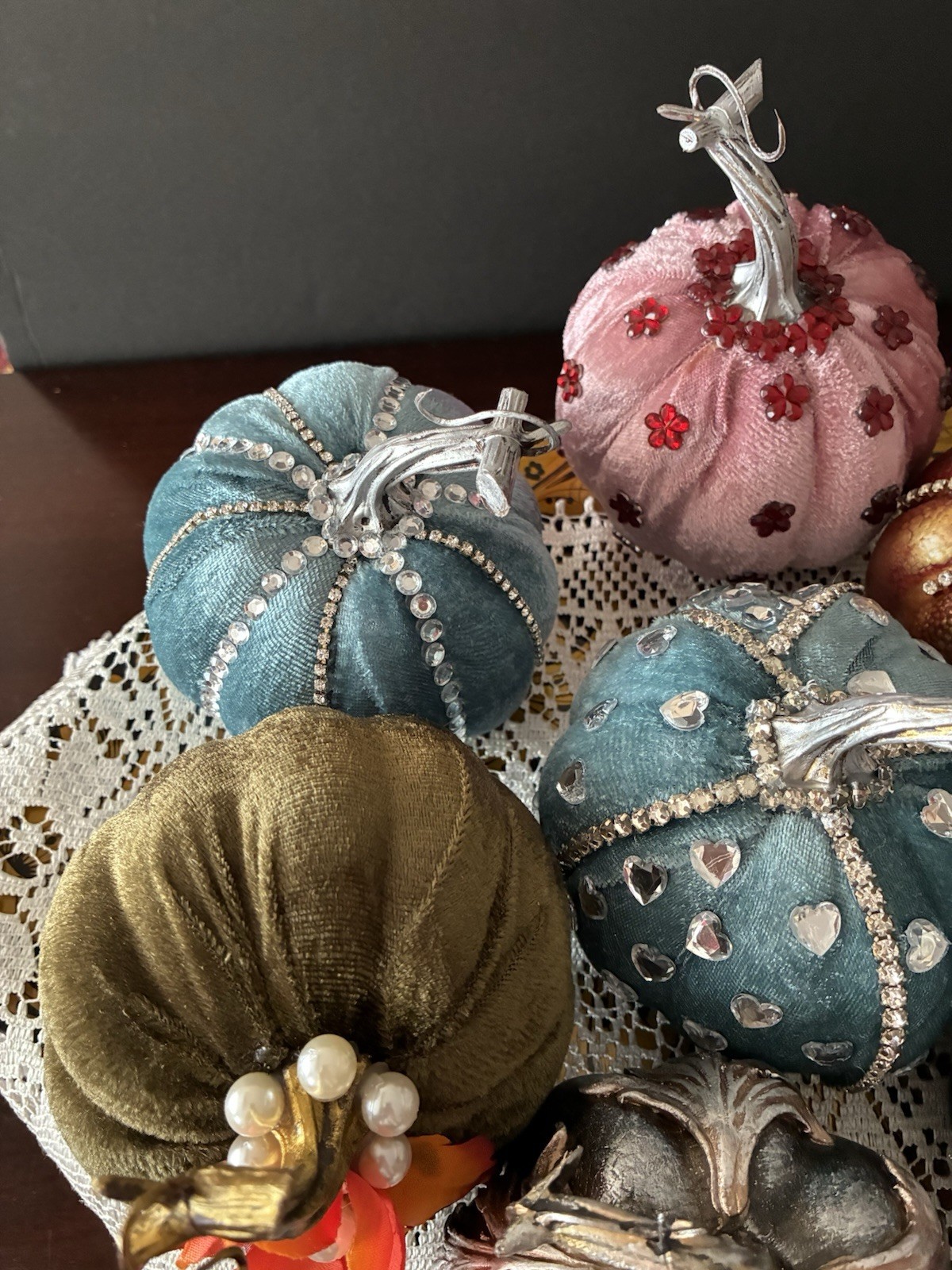 • Eight Beautiful Foam Velvet Decorated Pumpkins .