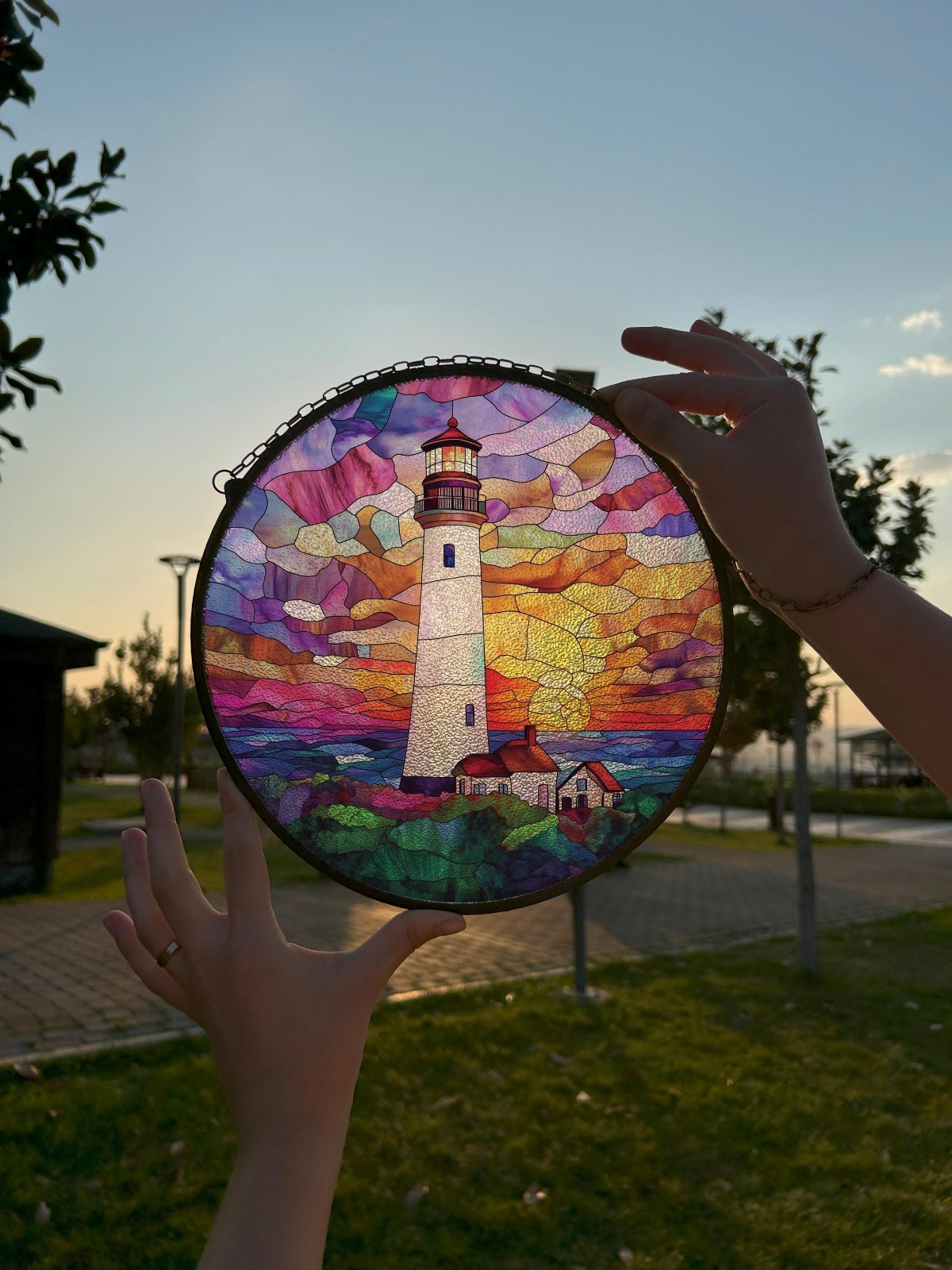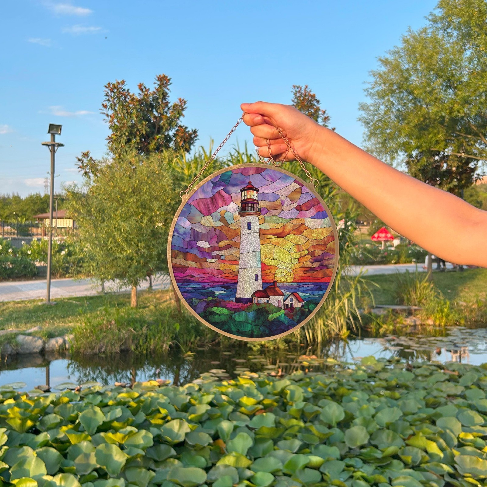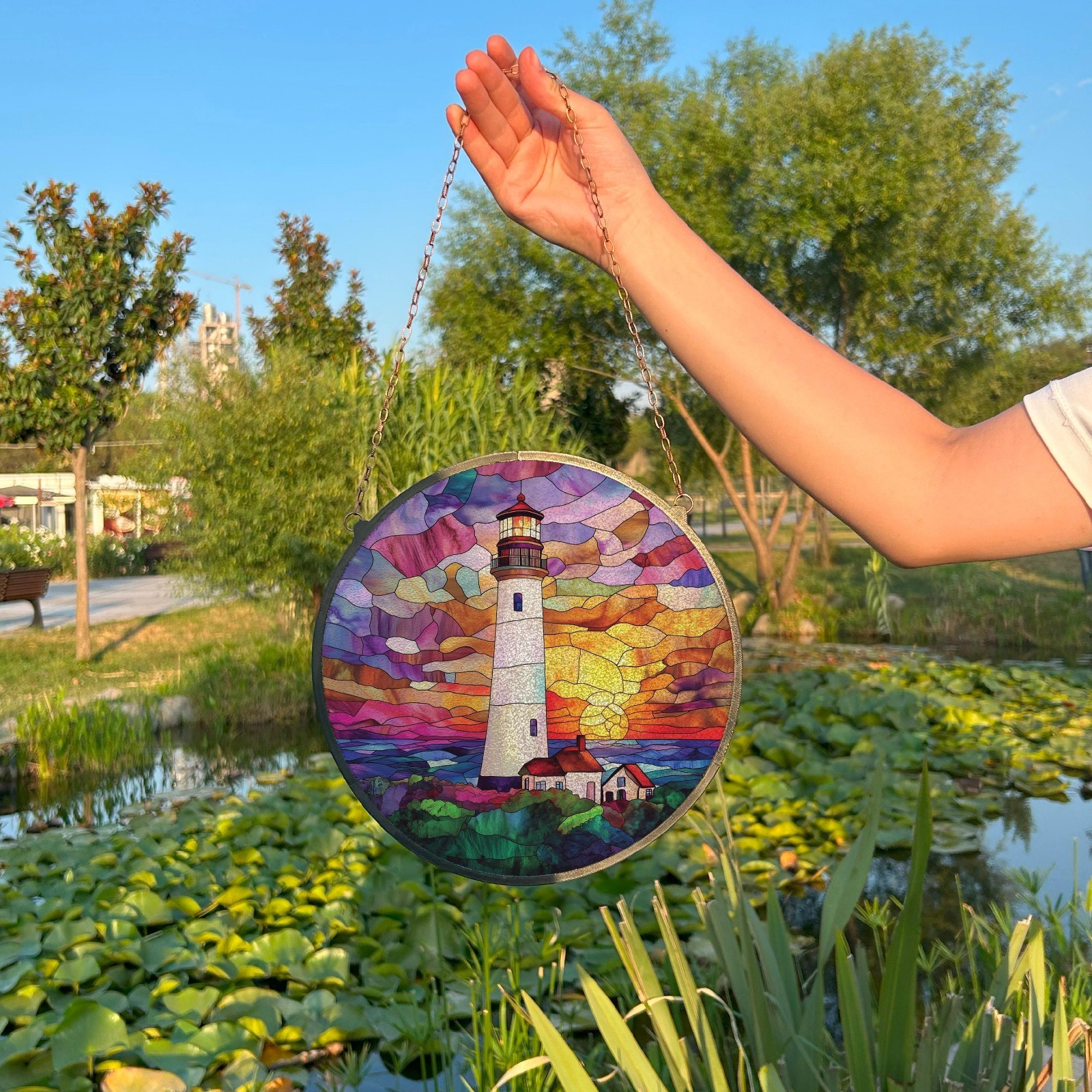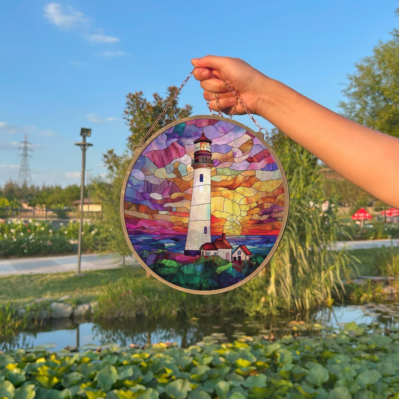 Colorful Lighthouse Stained Glass , Window Hanging Decor, Outdoor Sun