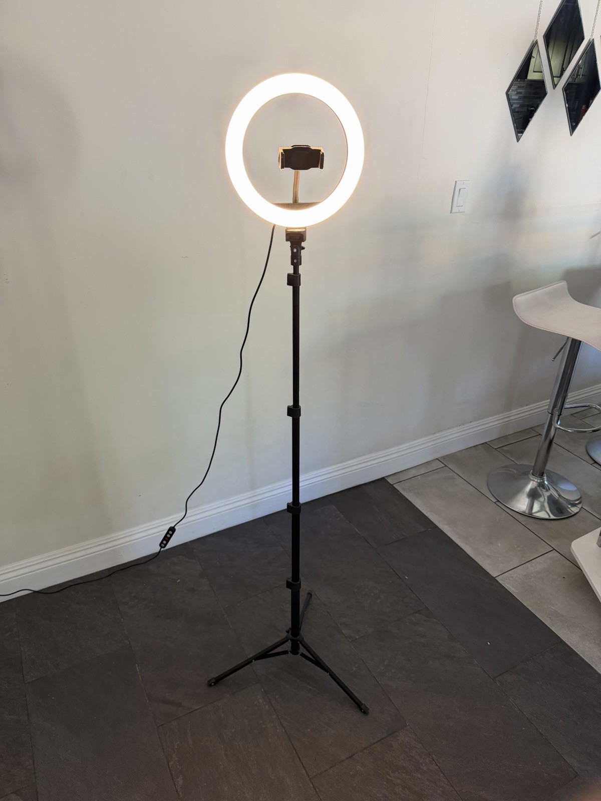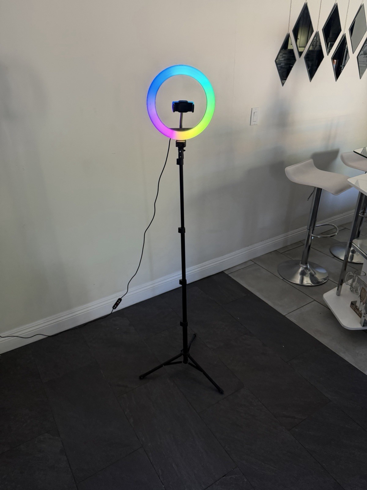 как выглядит RGB LED Ring Light with Adjustable Tripod Stand, Phone Holder, AC Powered фото