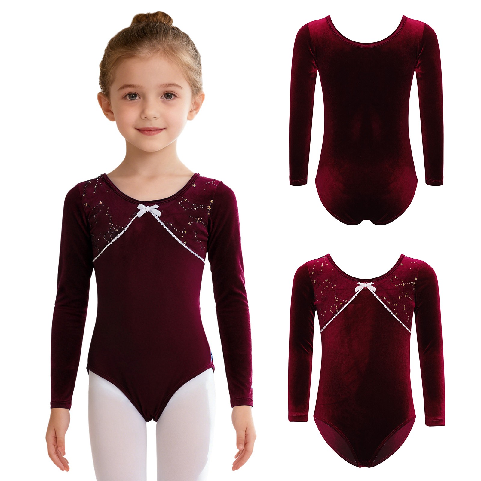 как выглядит US YiZYiF Kids Girls Bowknot Lace Trim Long Sleeve Leotard Ballet Dance Unitard фото