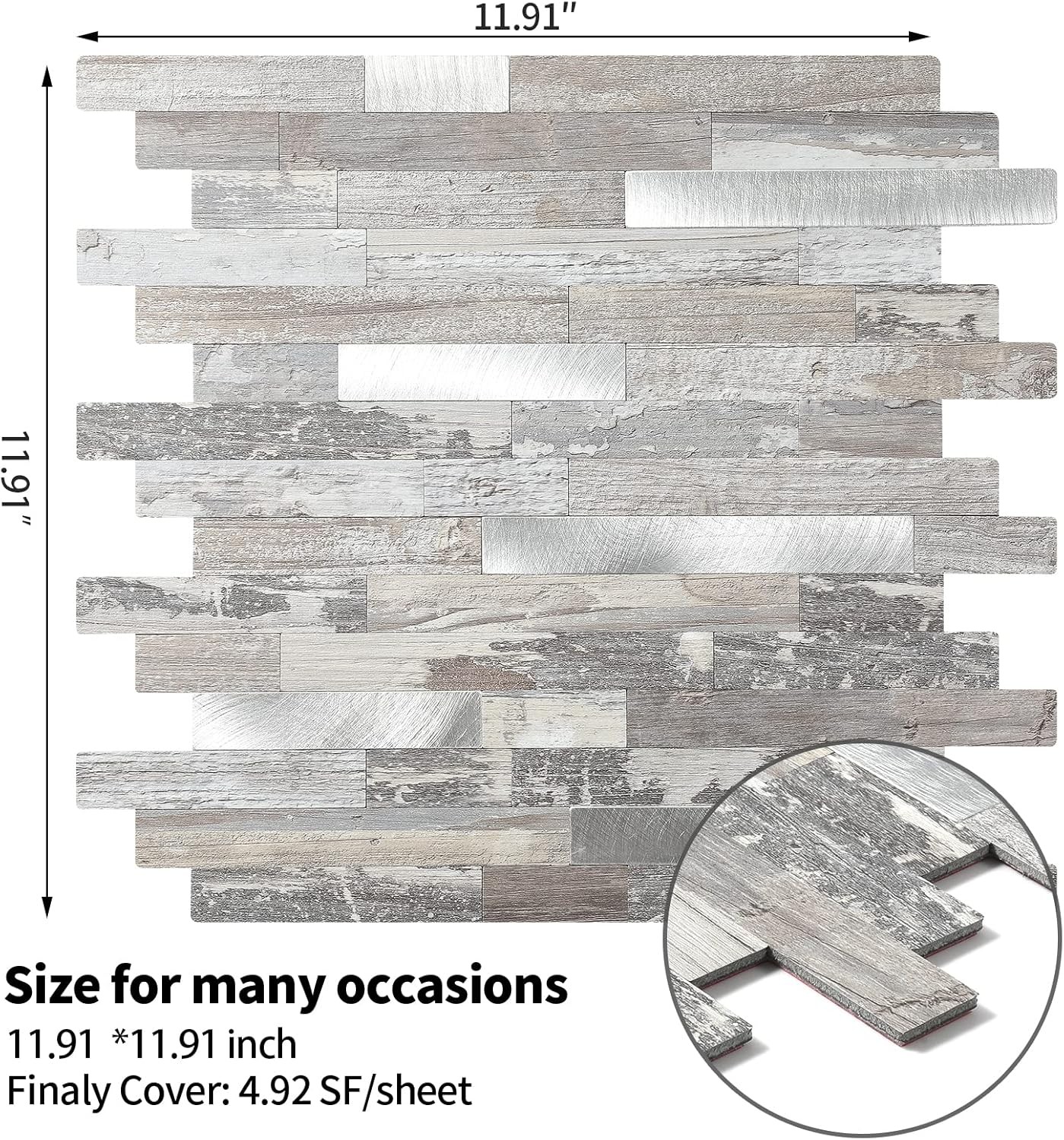 Light Rustic Peel and Stick Wood Metal Backsplash Tiles - 10 Sheets, 12x12