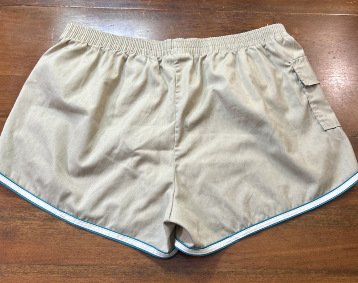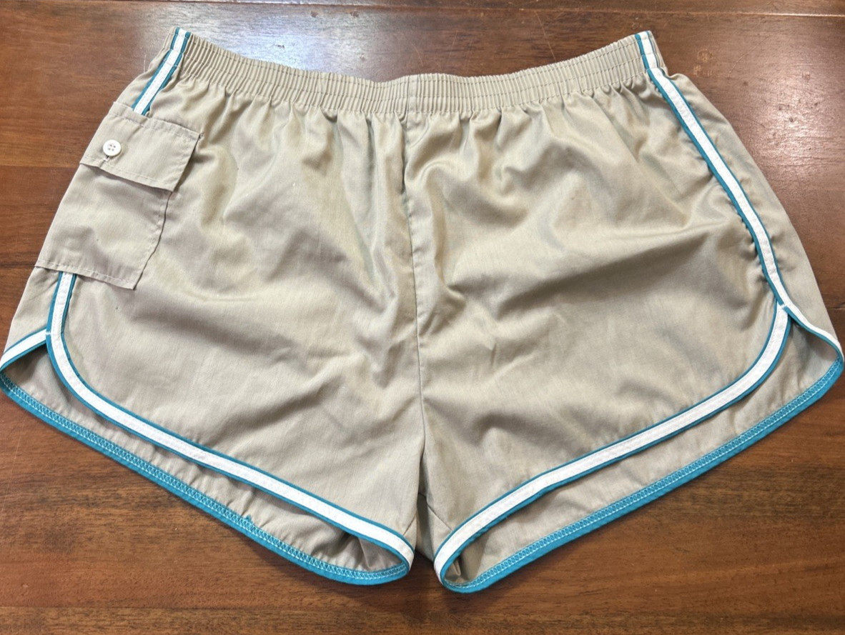 Vintage Mens Swim Trunks Trim Accent 1980's XL 40-42 Short Shorts Pocket Tan