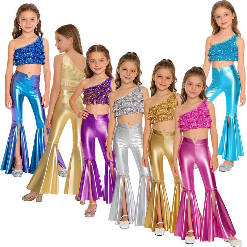 Kids Girls Costume Shiny Outfits Ballroom Dancewear Crop Top Set Hip Hop Dance