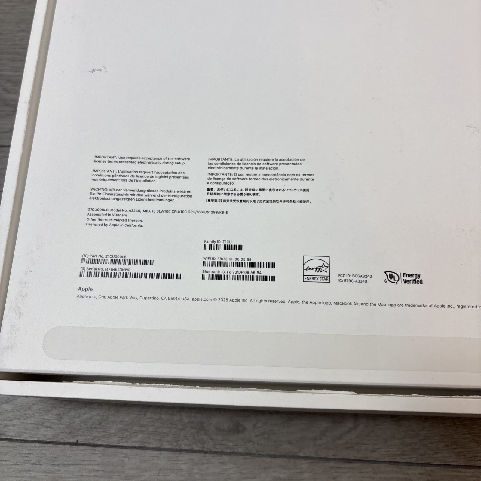 Empty Box ONLY Macbook Air A3240 13 2025 16GB 512 GB Silver Laptop White Box