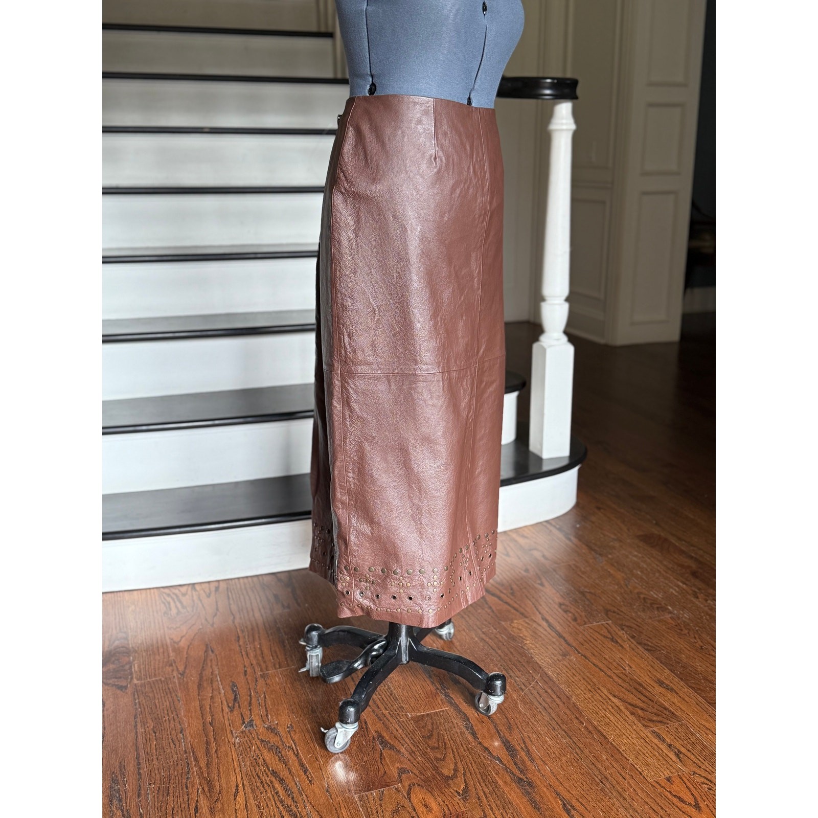 как выглядит Vintage Long Brown Leather Skirt Boho CowGirl SouthWestern Fall Winter фото