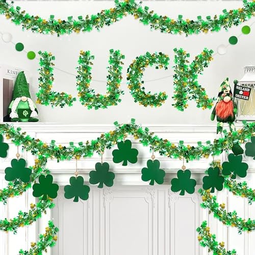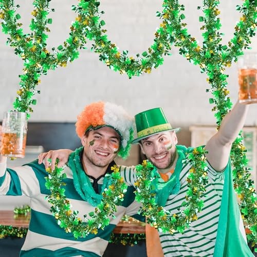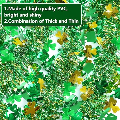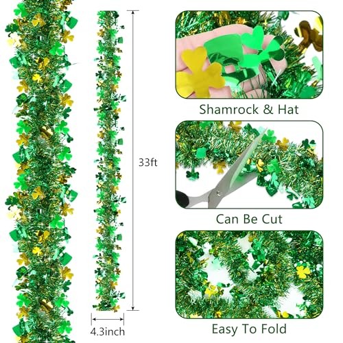St Patricks Day Garland Decor Gold Green Shamrock Hat Tinsel Garland, 33 FT