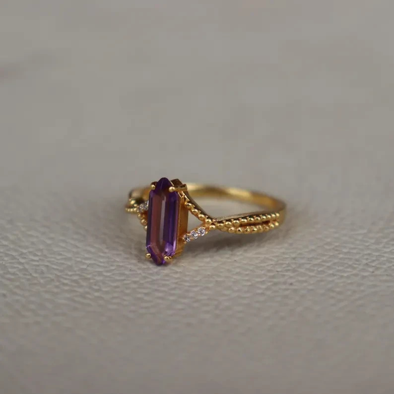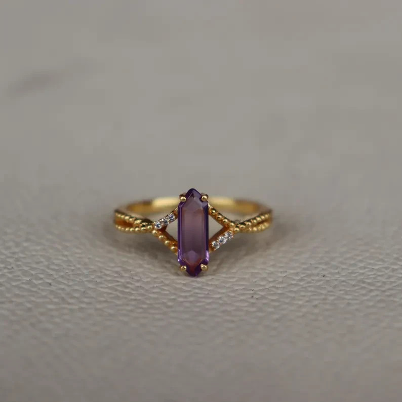 • 925 Sterling Silver Natural Amethyst Ring, Handmade Gold Plated Ring, Silver