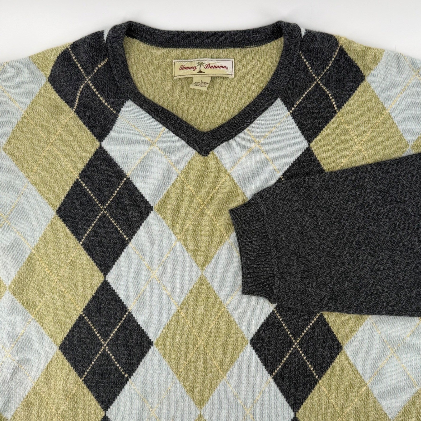 Tommy Bahama Men's Argyle V Neck Sweater Large Wool Cotton blend Gray Blue Tan