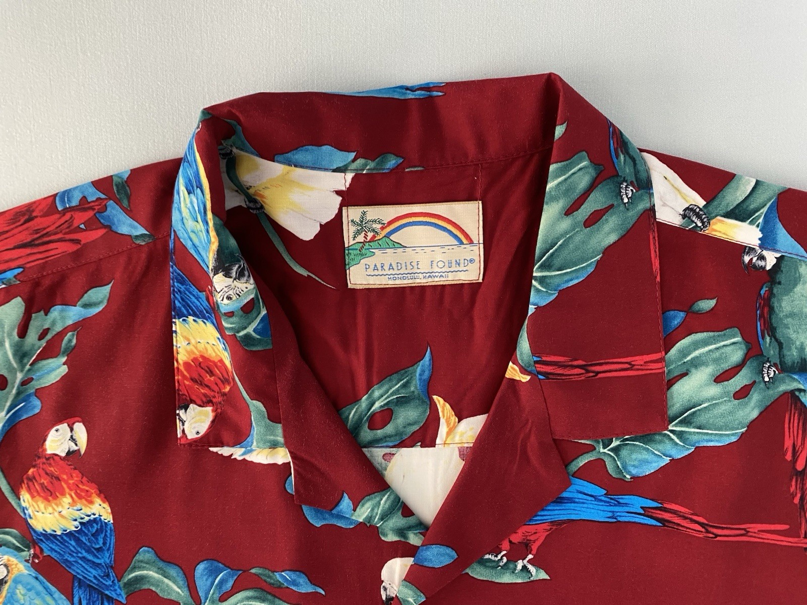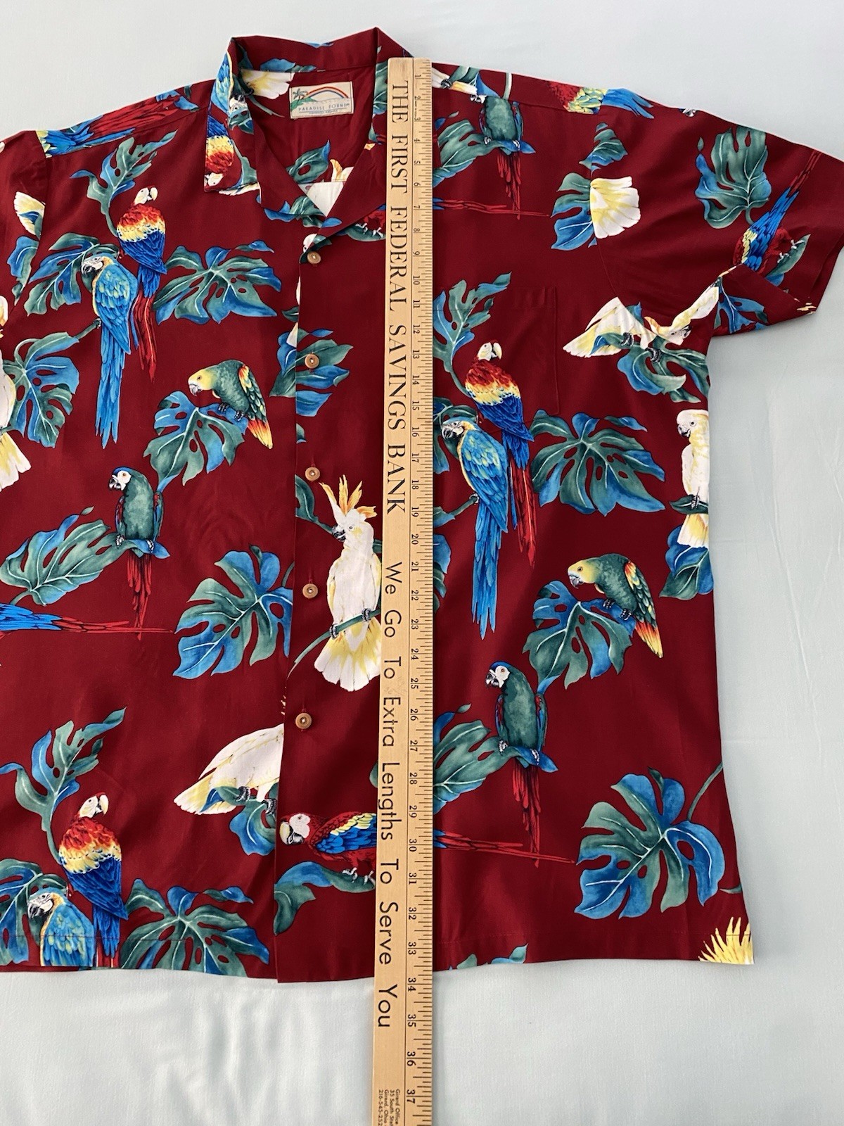 Paradise Found Hawaiian Aloha Tiki Shirt Men s 3XL Crimson w/Parrots Macaws