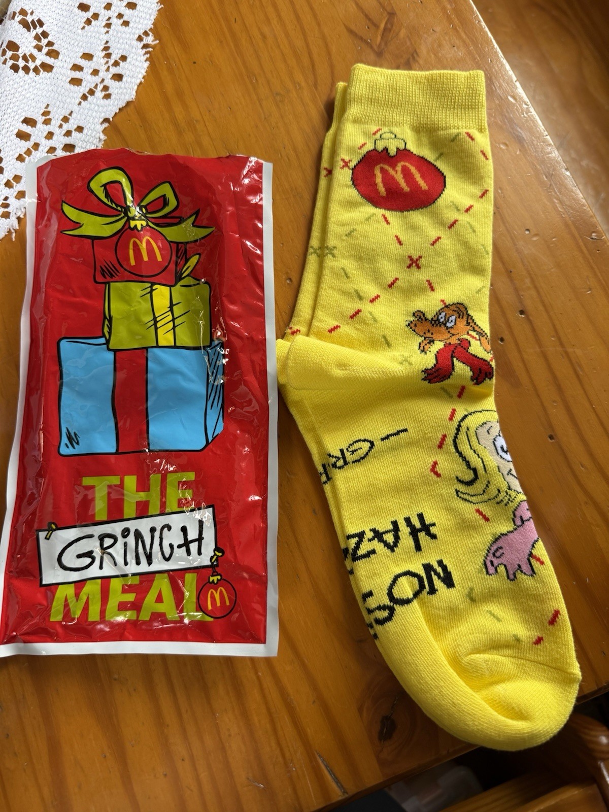 как выглядит McDonald s Grinch Meal 2025 Socks Yellow Collectible Opened With Bag Rare фото