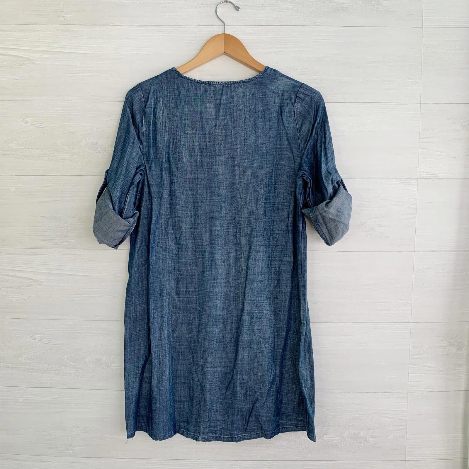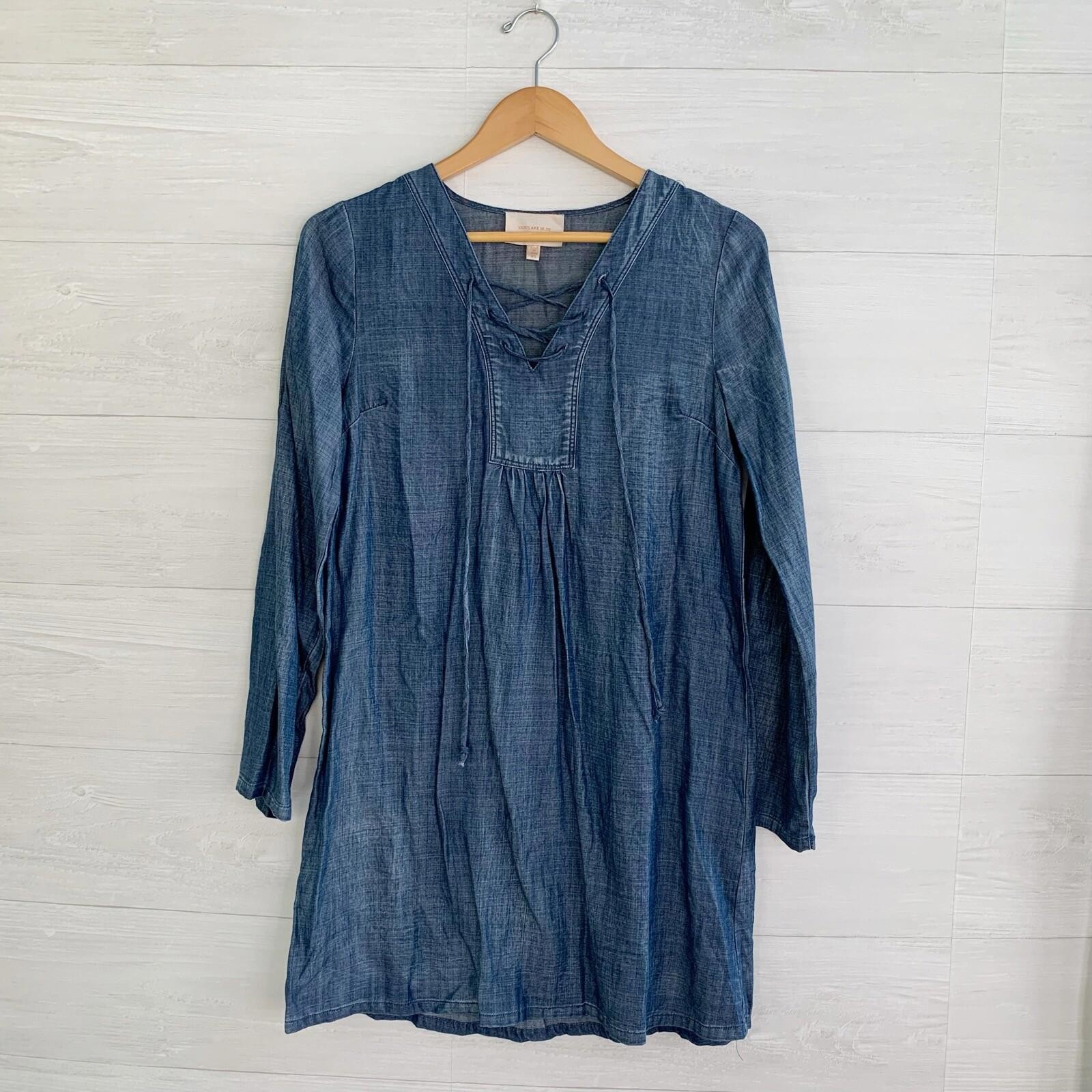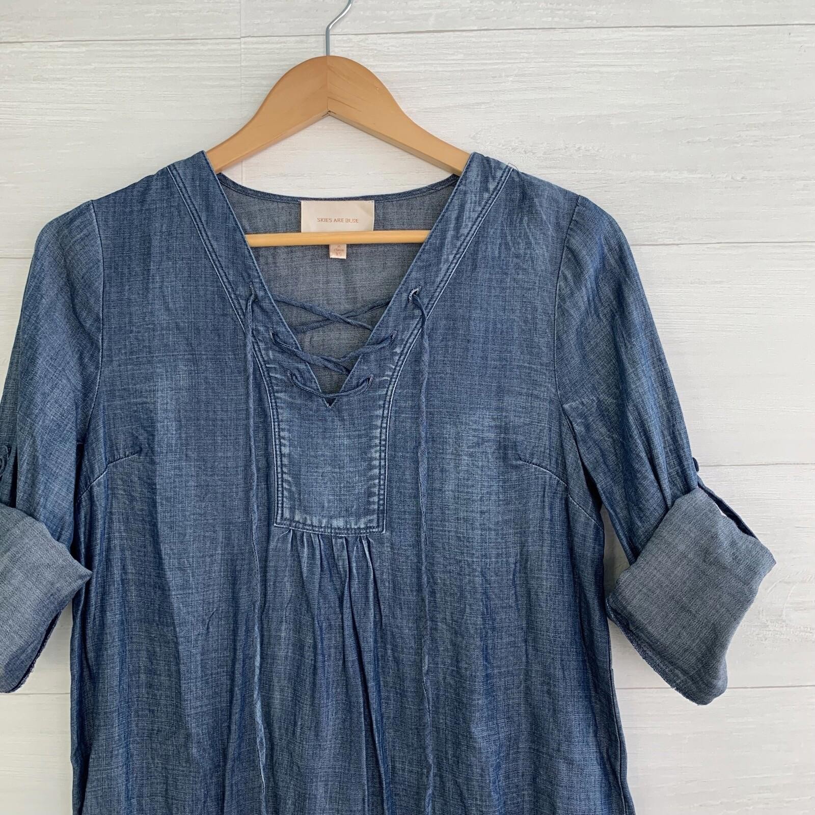 Skies are Blue - Blue chambray lace-up shift dress roll tab long sleeves, XS