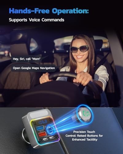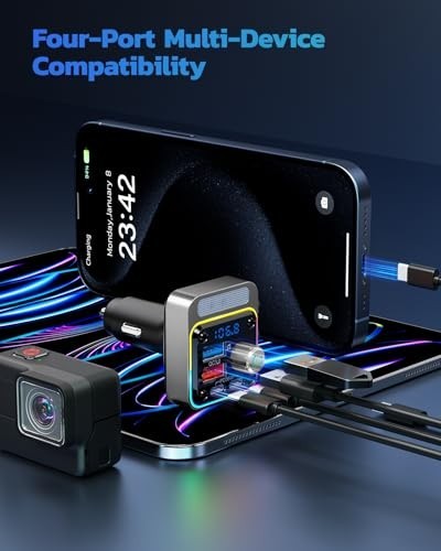 54W Bluetooth Car Adapter, 4 USB Charging Ports, FM Transmitter, Deep Bass, LED