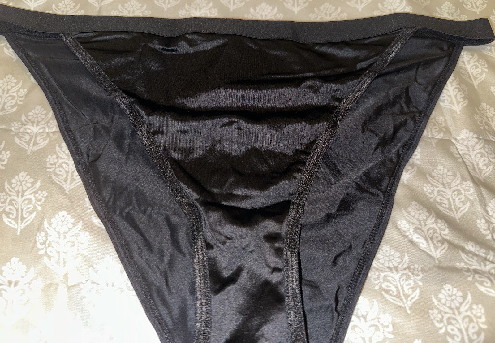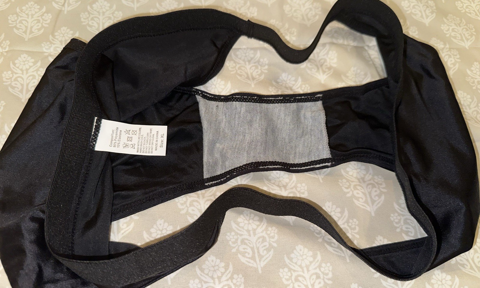 как выглядит Glossy Black Wet Look Second Skin Satin Buttery Soft String Bikini Pantie XL NEW фото