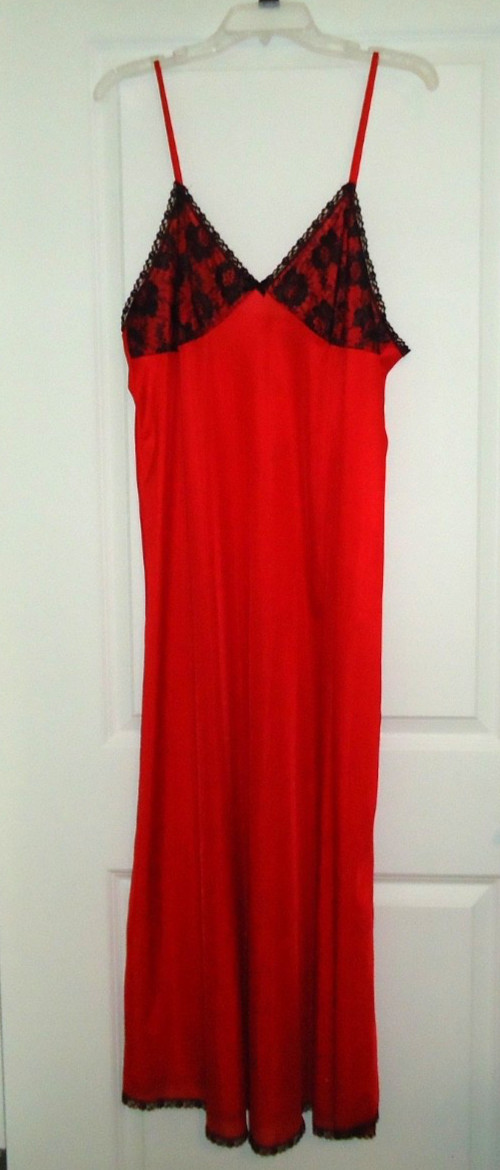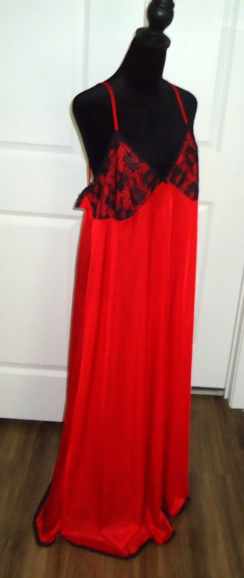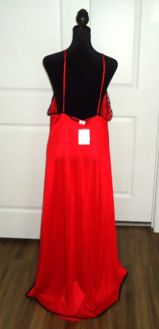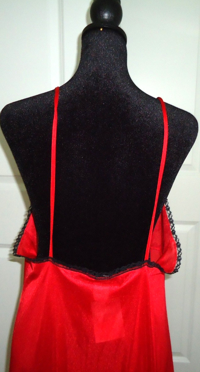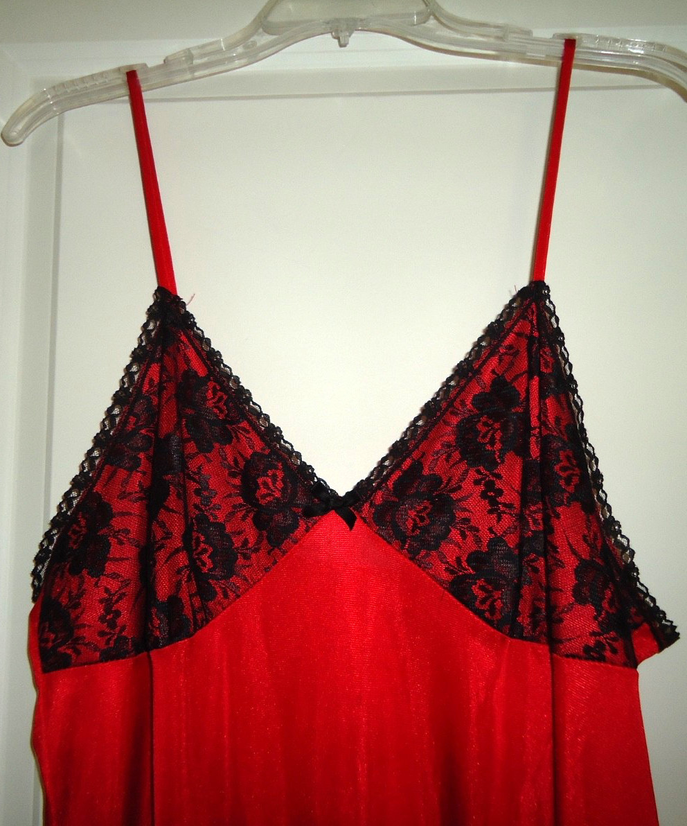 RARE Vtg-70s USA Women's 100 Nylon Red Black Floral Lace Long Slip Dress Siz-XL