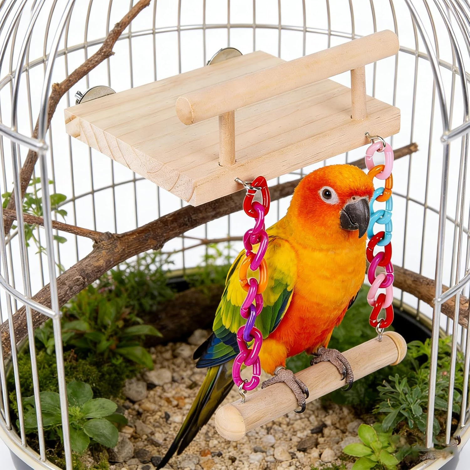 Natural Wood Bird Perch Platform with Colorful Chain Swing Toy, Parrot Hanging S
