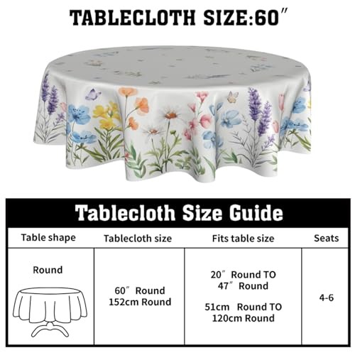 • Spring Floral Tablecloth Round 60 Inch 60" Round Green Blue Pink Purple White