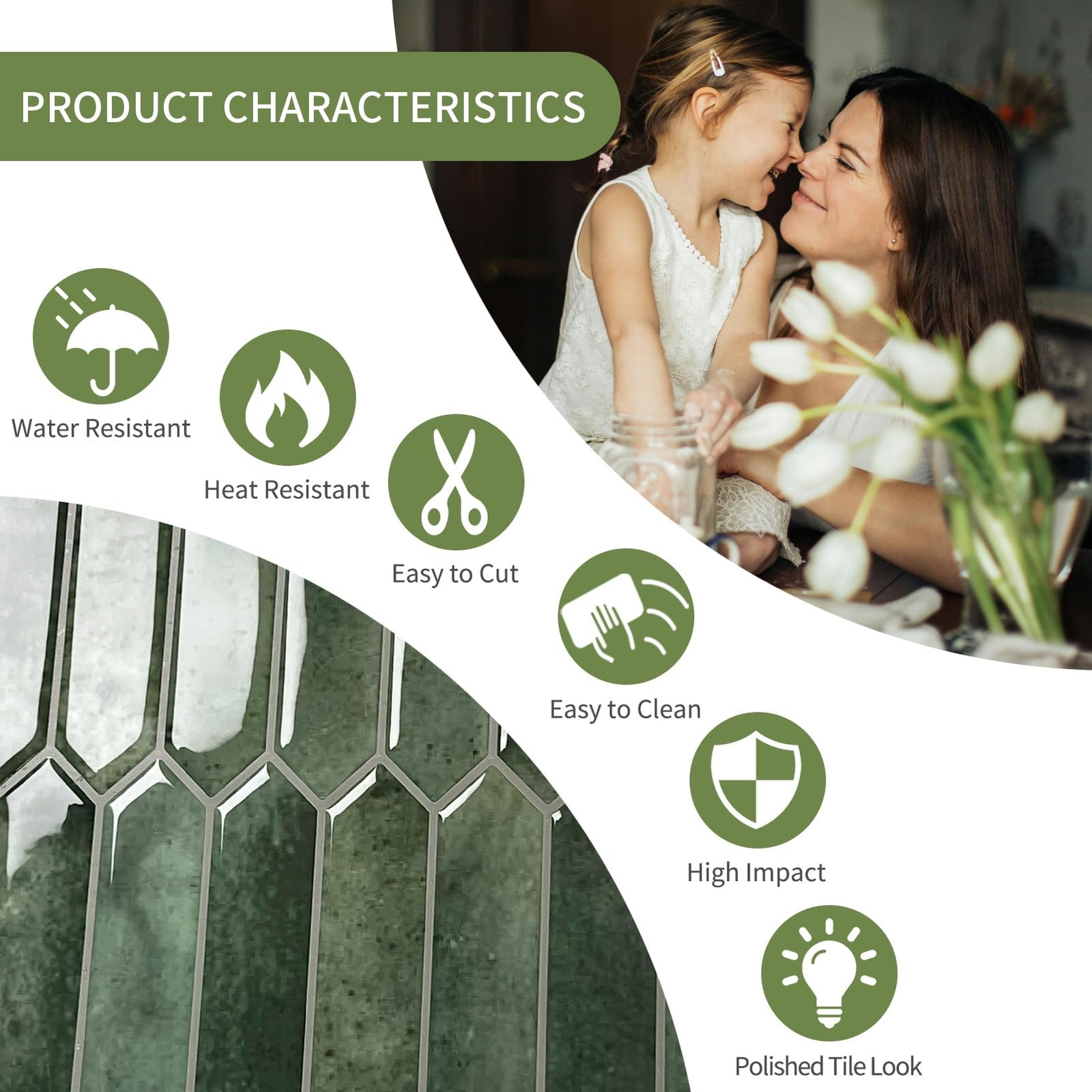 • Green Long Hexagon Tile Peel and Stick Backsplash, 10 Sheets Self-Adhesive Wa...
