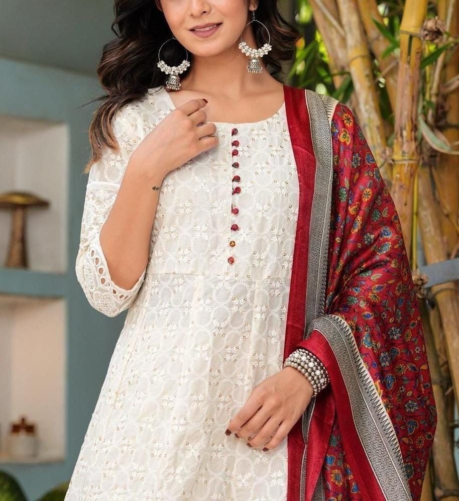 как выглядит Women s Embroidered Kurta Pant Set with Printed Dupatta Ethnic Indian Suit фото