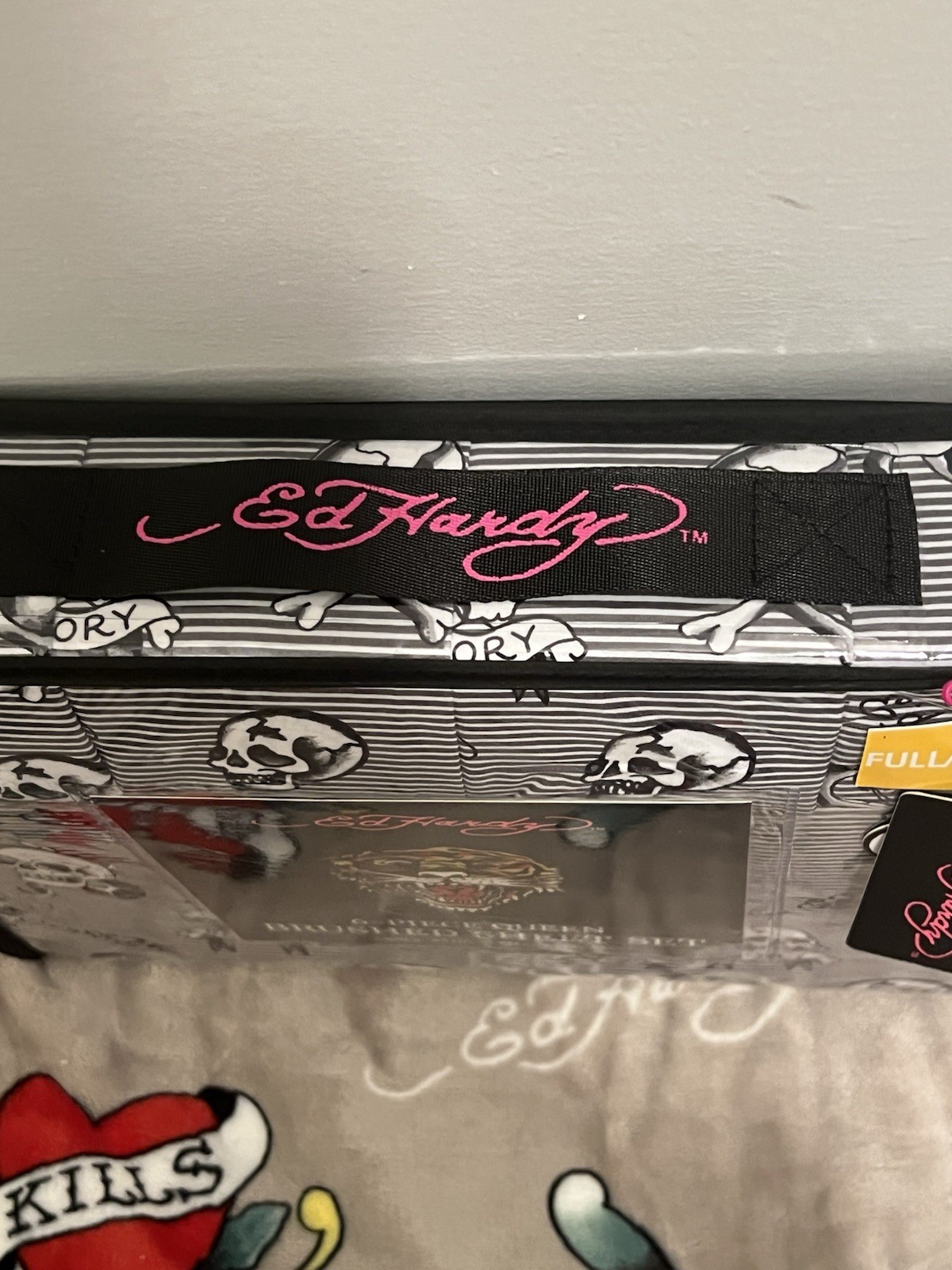 как выглядит Ed Hardy Queen 6pc Black White Skull Snake Print Brushed Sheet Set NWT фото