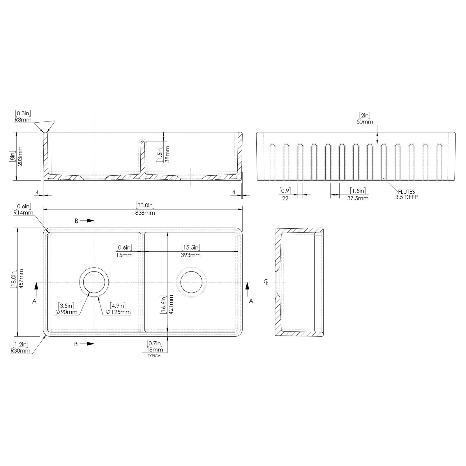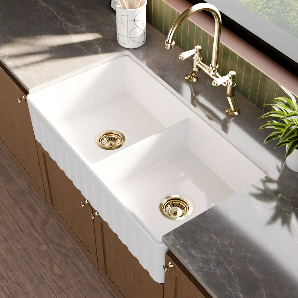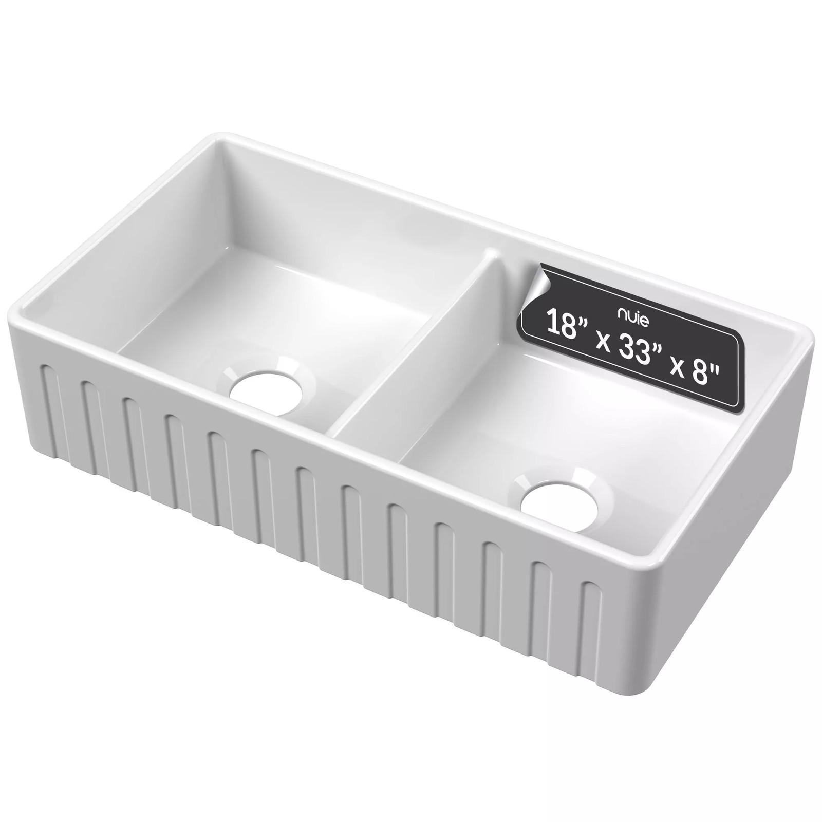 Nuie Farmhouse Apron Front Kitchen Sink Stepped Weir, Double Bowl 33x18x8