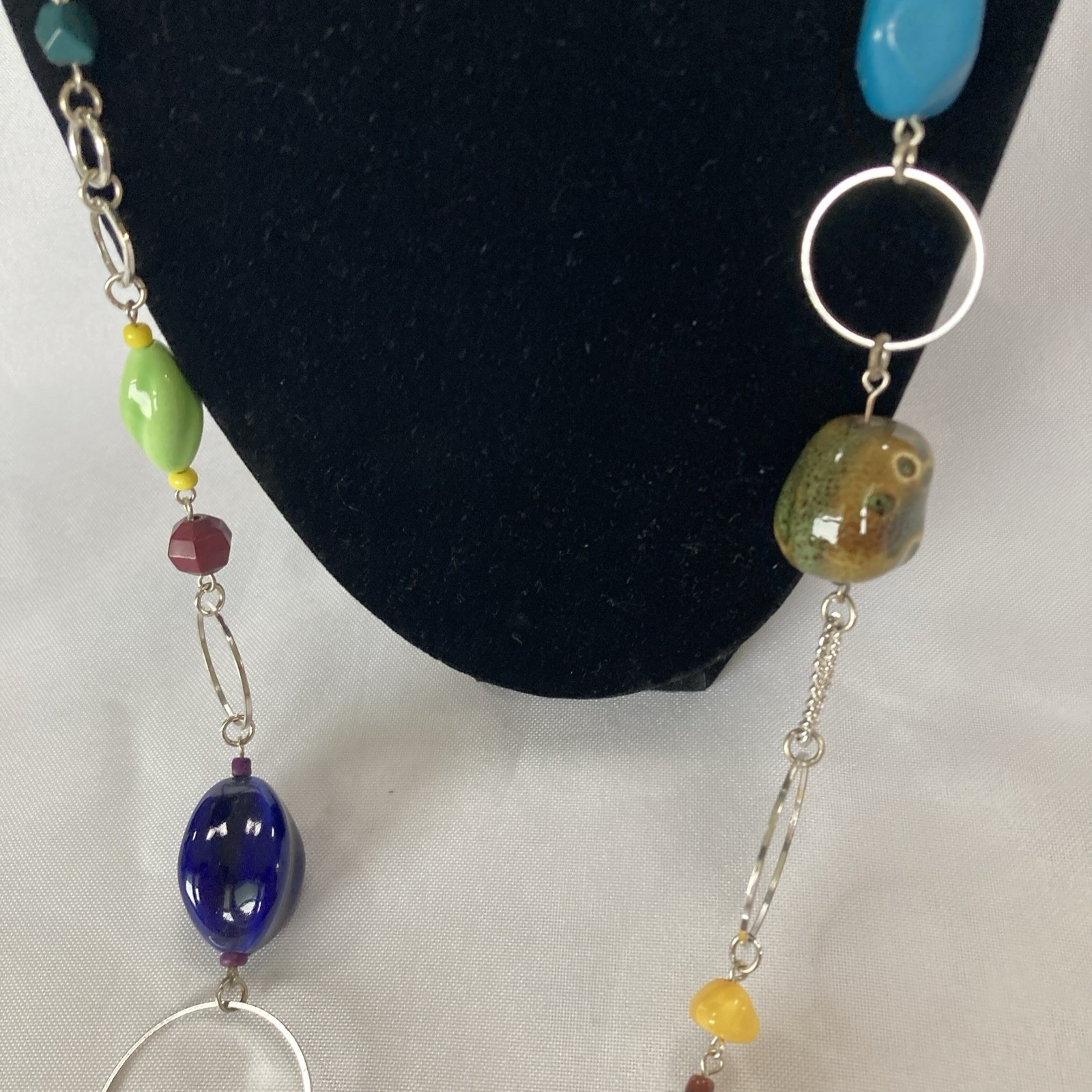 Necklace Colorful Retro Ceramic Beads Silver Tone Chain Lobster Clasp Adjustable