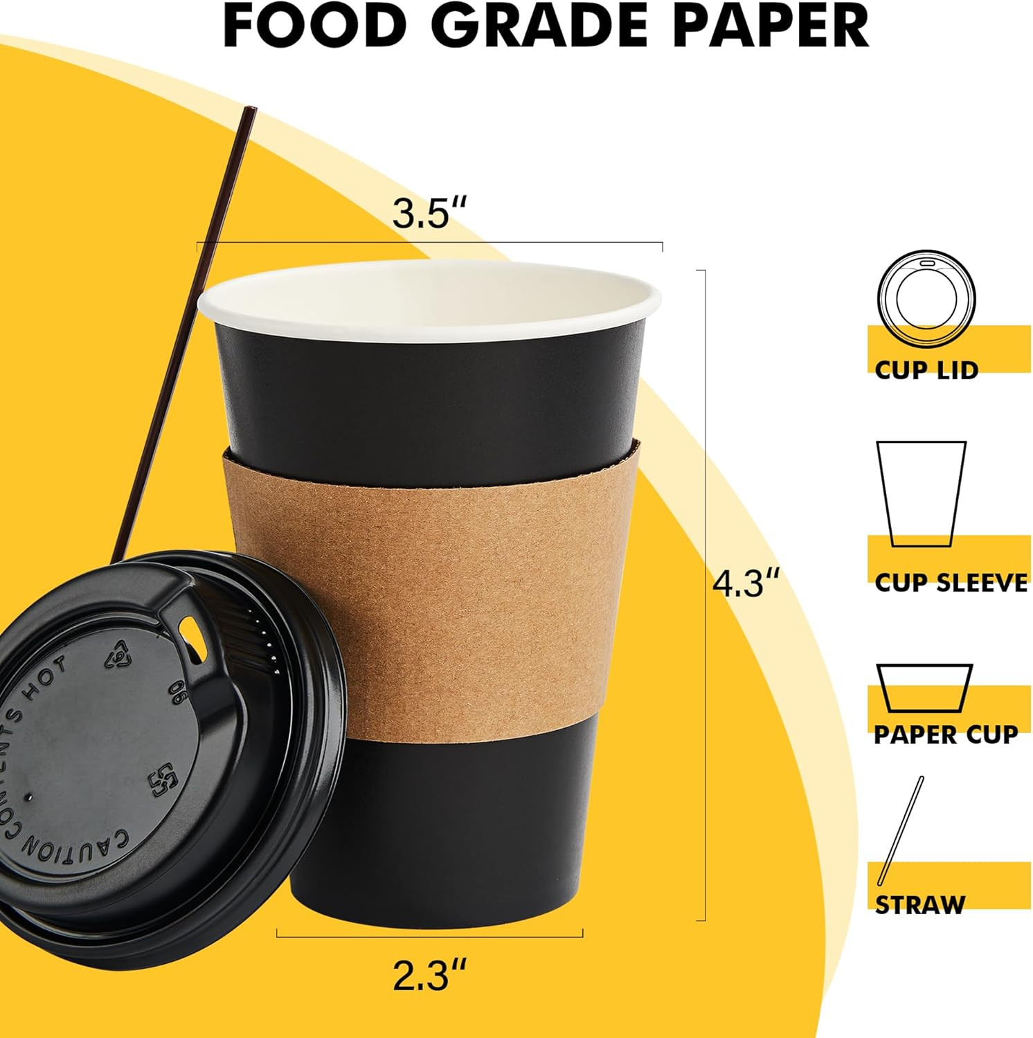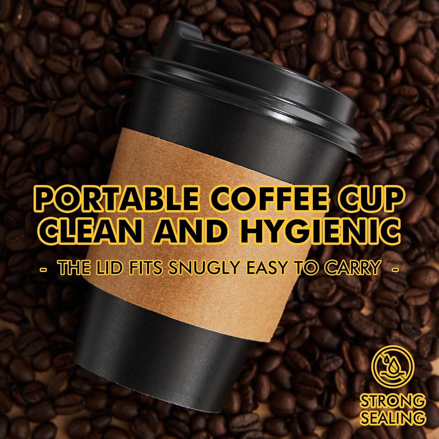 12 Oz Disposable Black Coffee Cups with Lids and Sleeves, 100 Pack