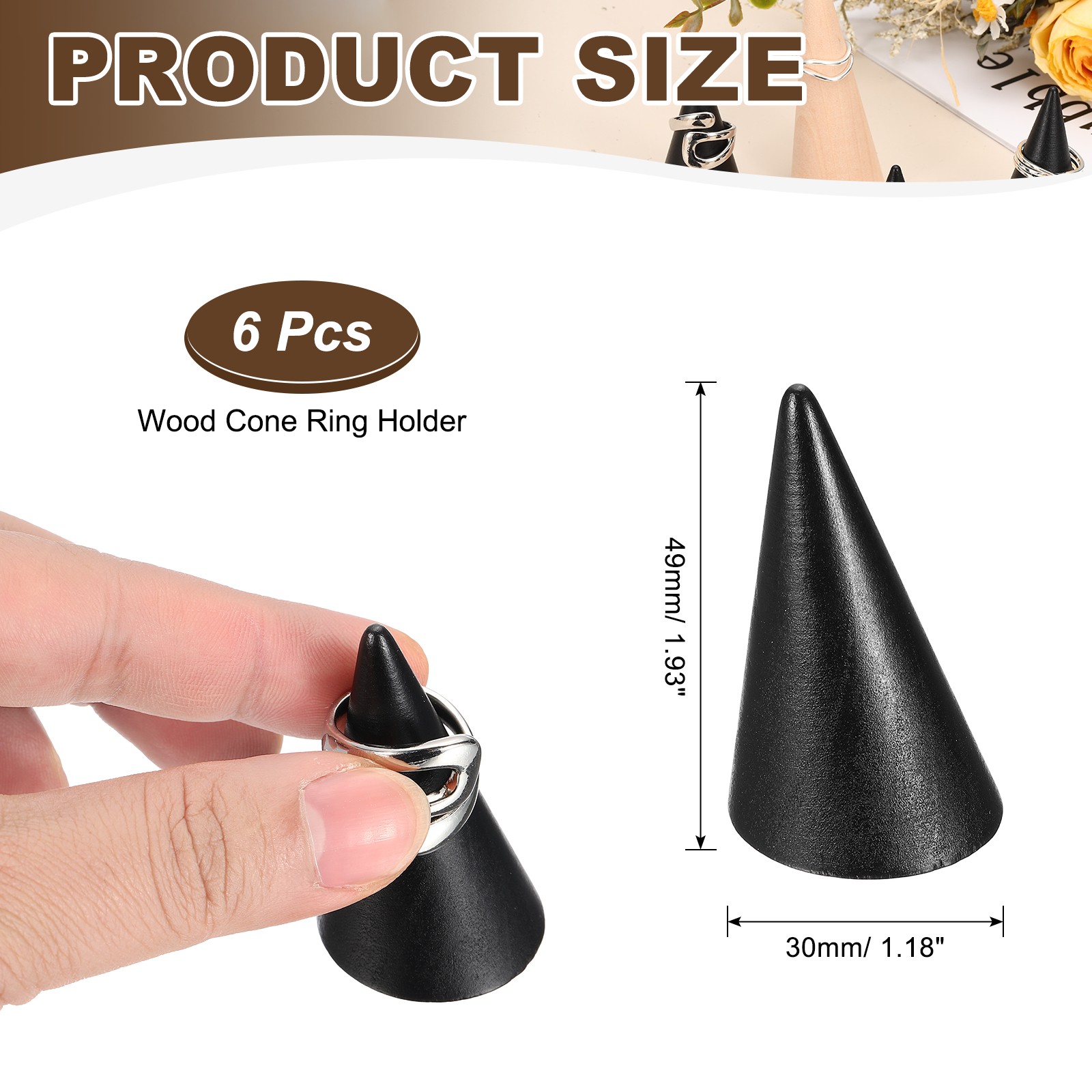 Wood Cone Ring Holder, 6 Pcs Finger Jewelry Display Stand, Black 30x49mm
