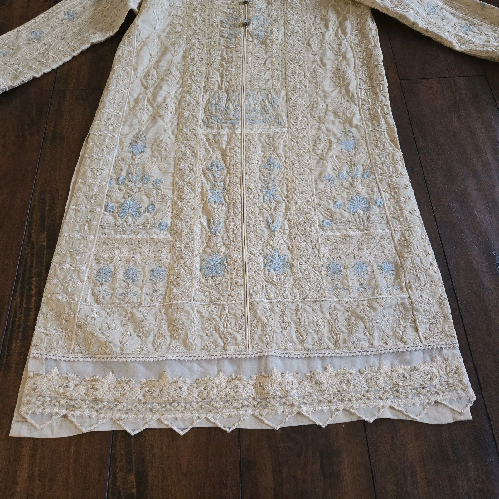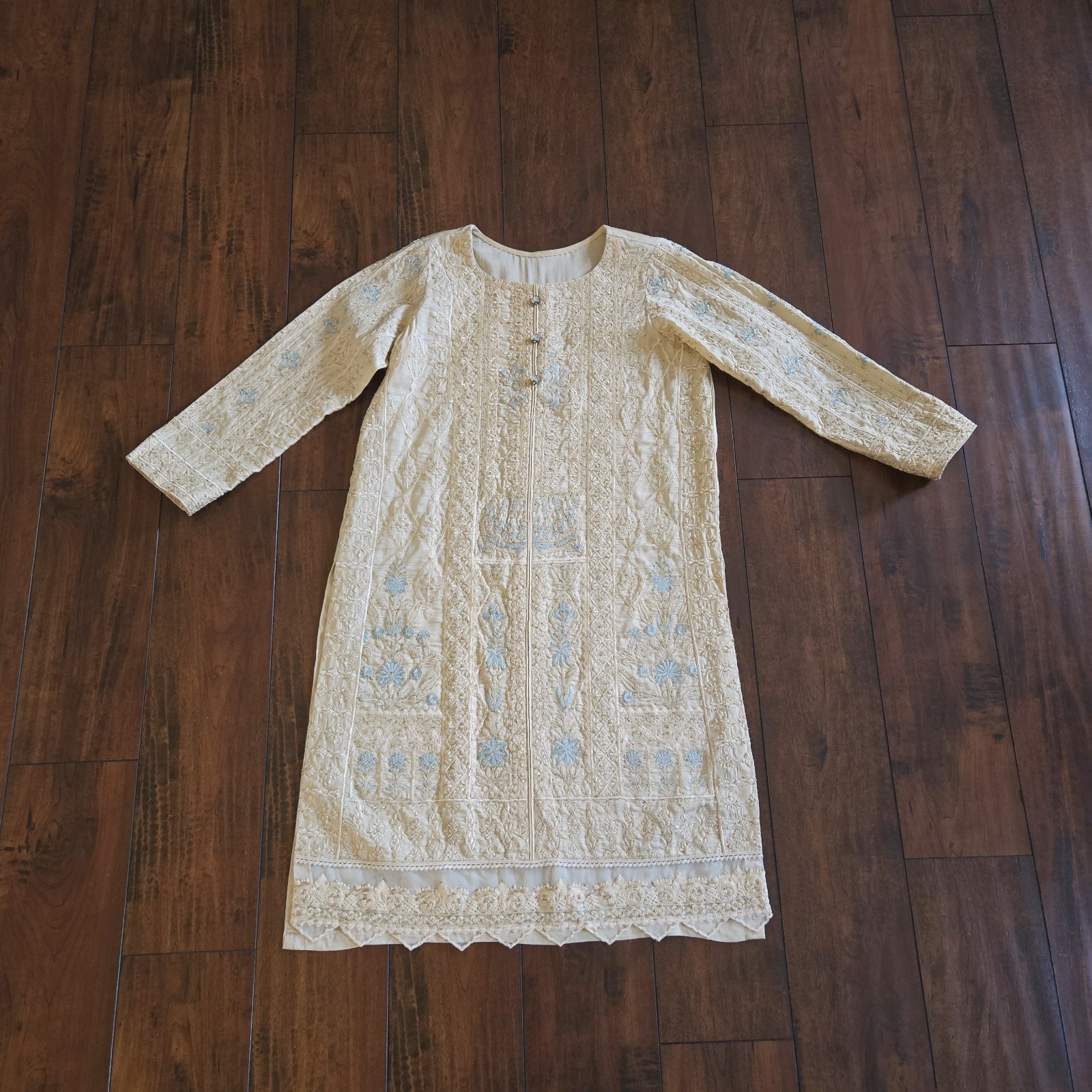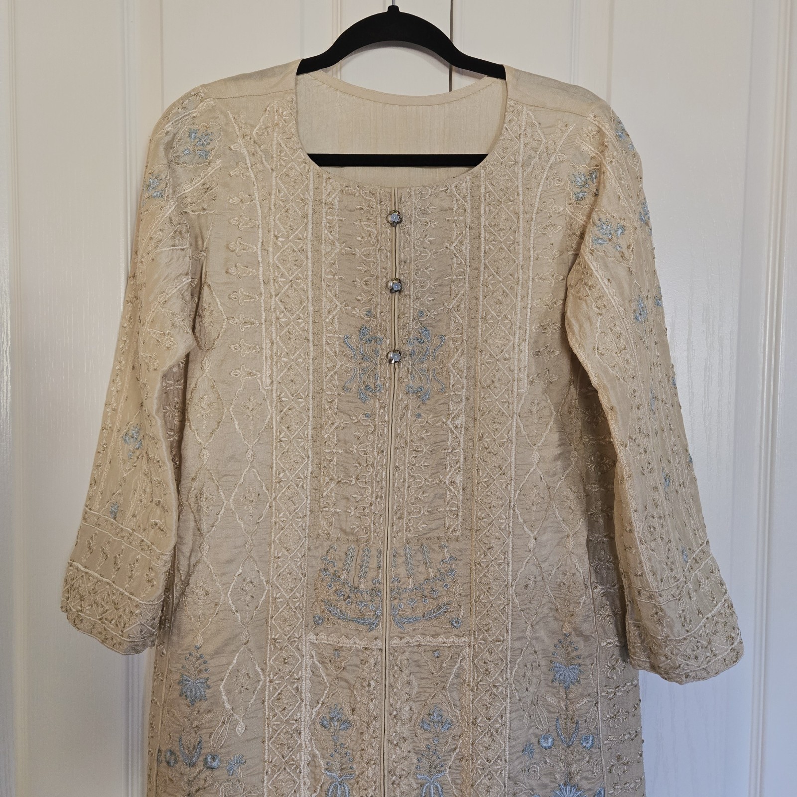 как выглядит Embroidered Salwar Kameez Dupatta Long Scarf Beige Gold Organza Party Wear Dress фото