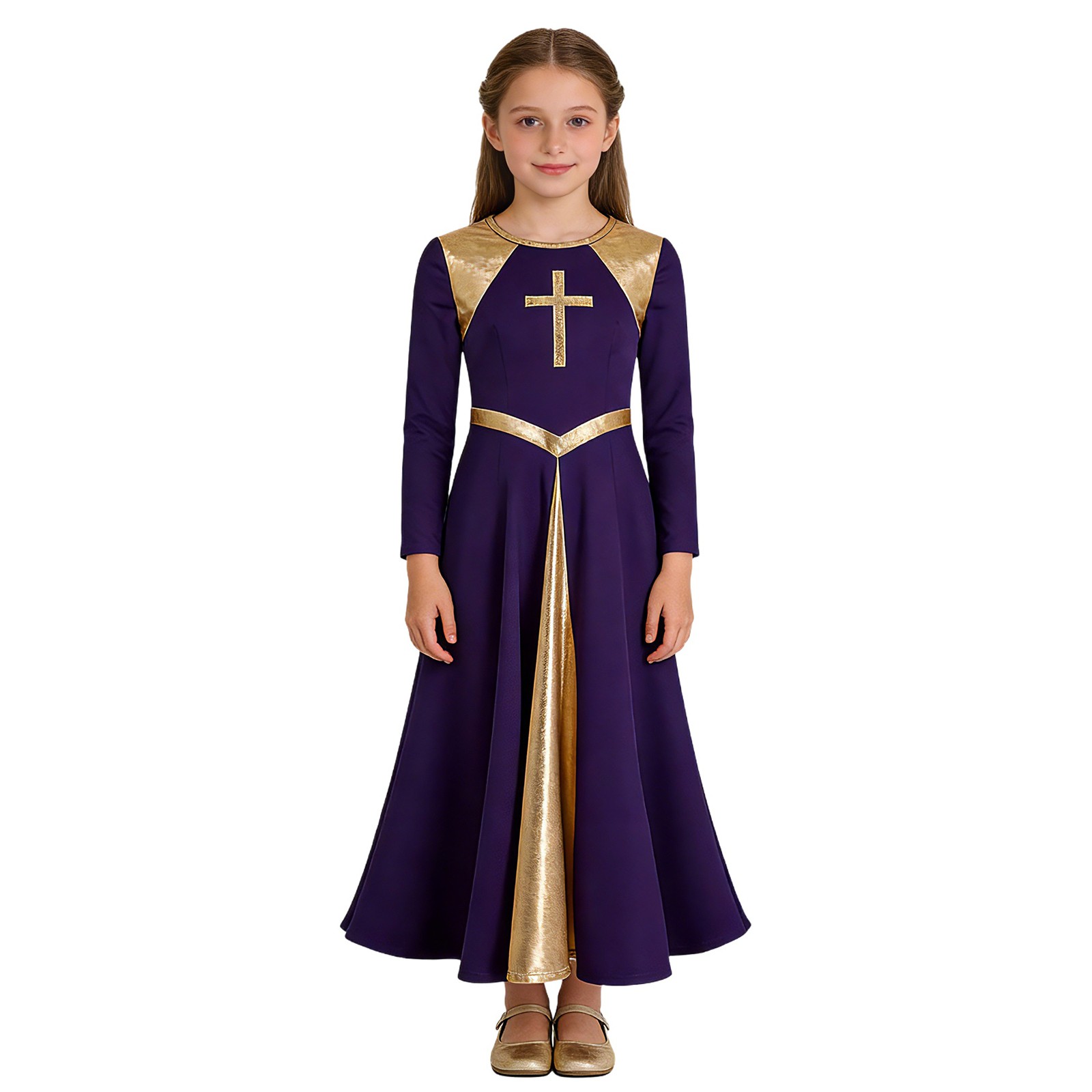 Girls Kids Metallic Gold Color Block Liturgical Praise Dance Worship Long Dress