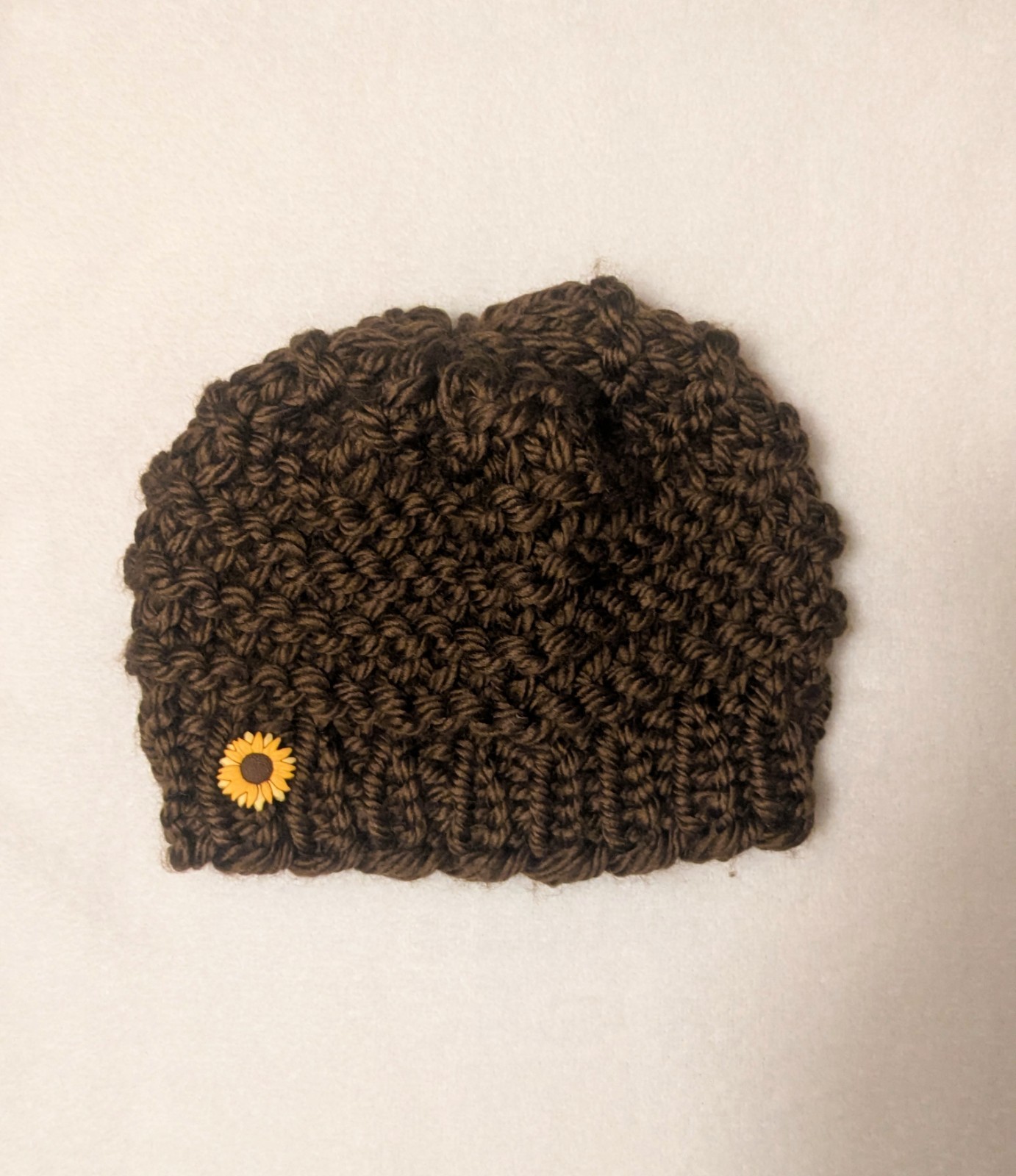 Handmade Knit Kids Beanie Hat Brown with Sunflower NEW