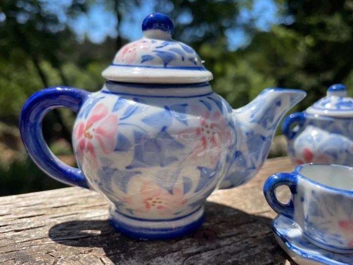 Mini Porcelain Tea Set 9 Pieces Blue Pink Floral