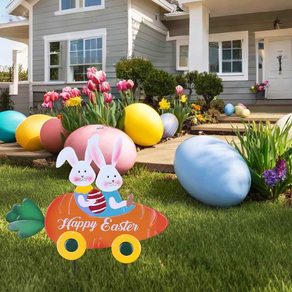 Easter Decorations Outdoor, Metal Bunny Carrot Cart Decorative Garden Stakes, Ha