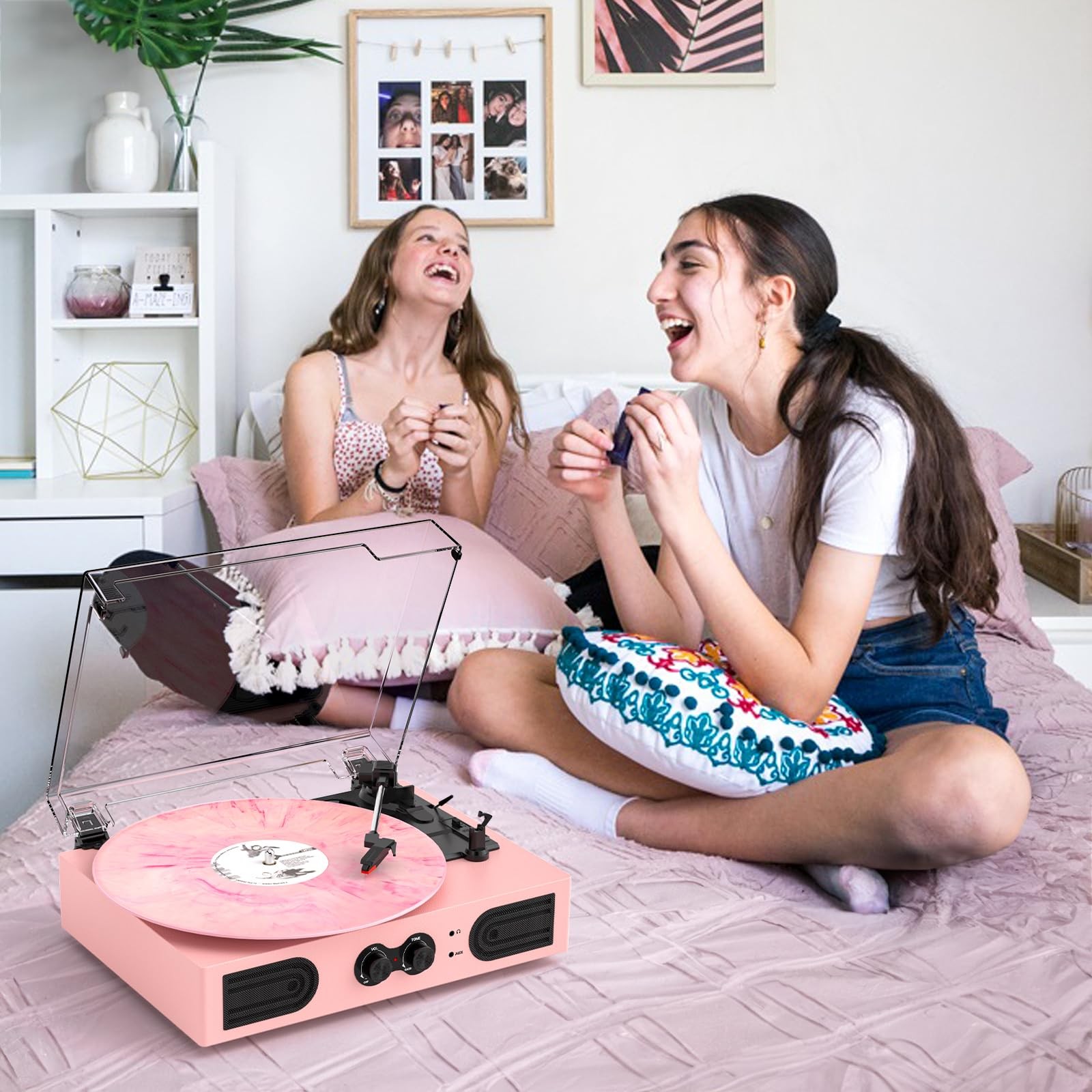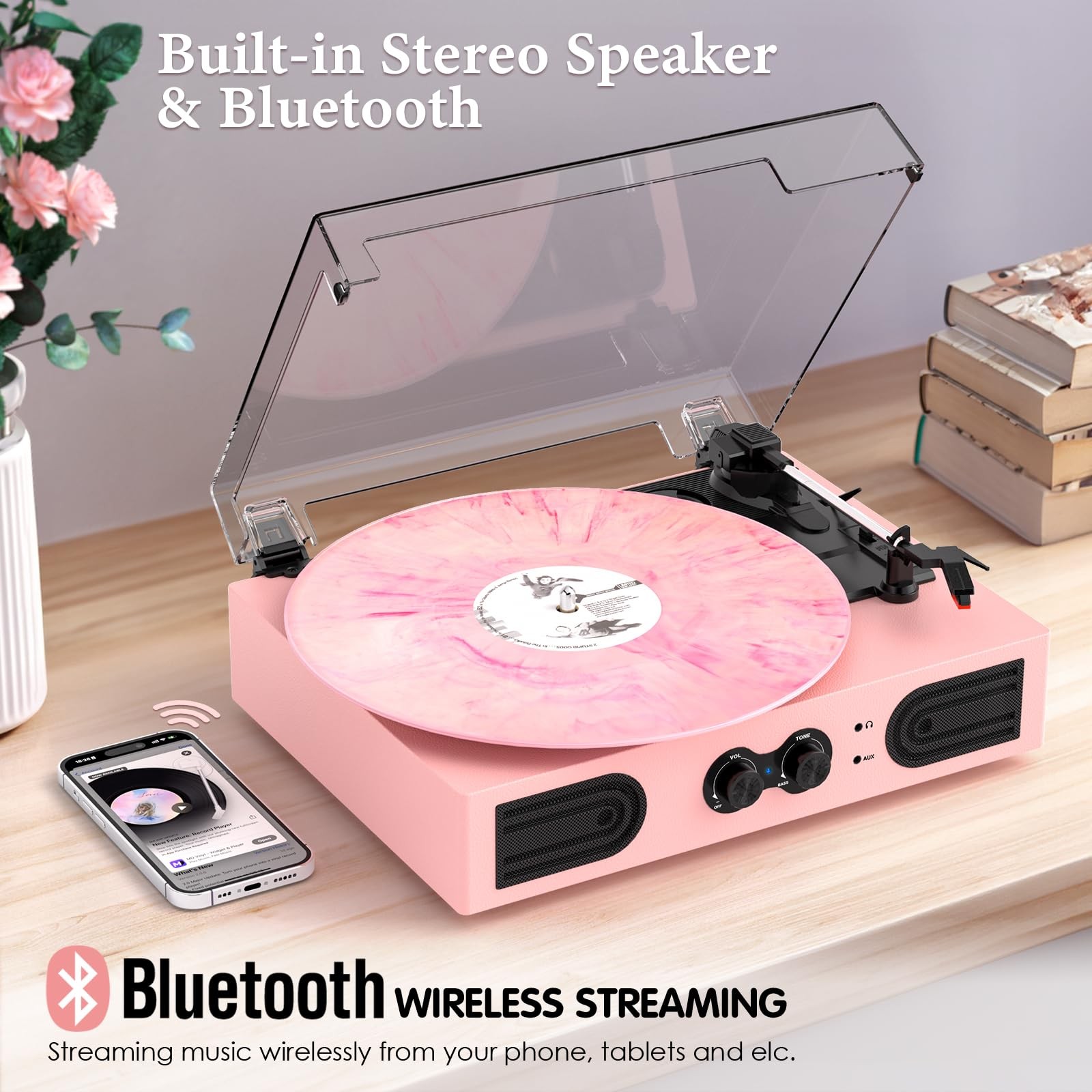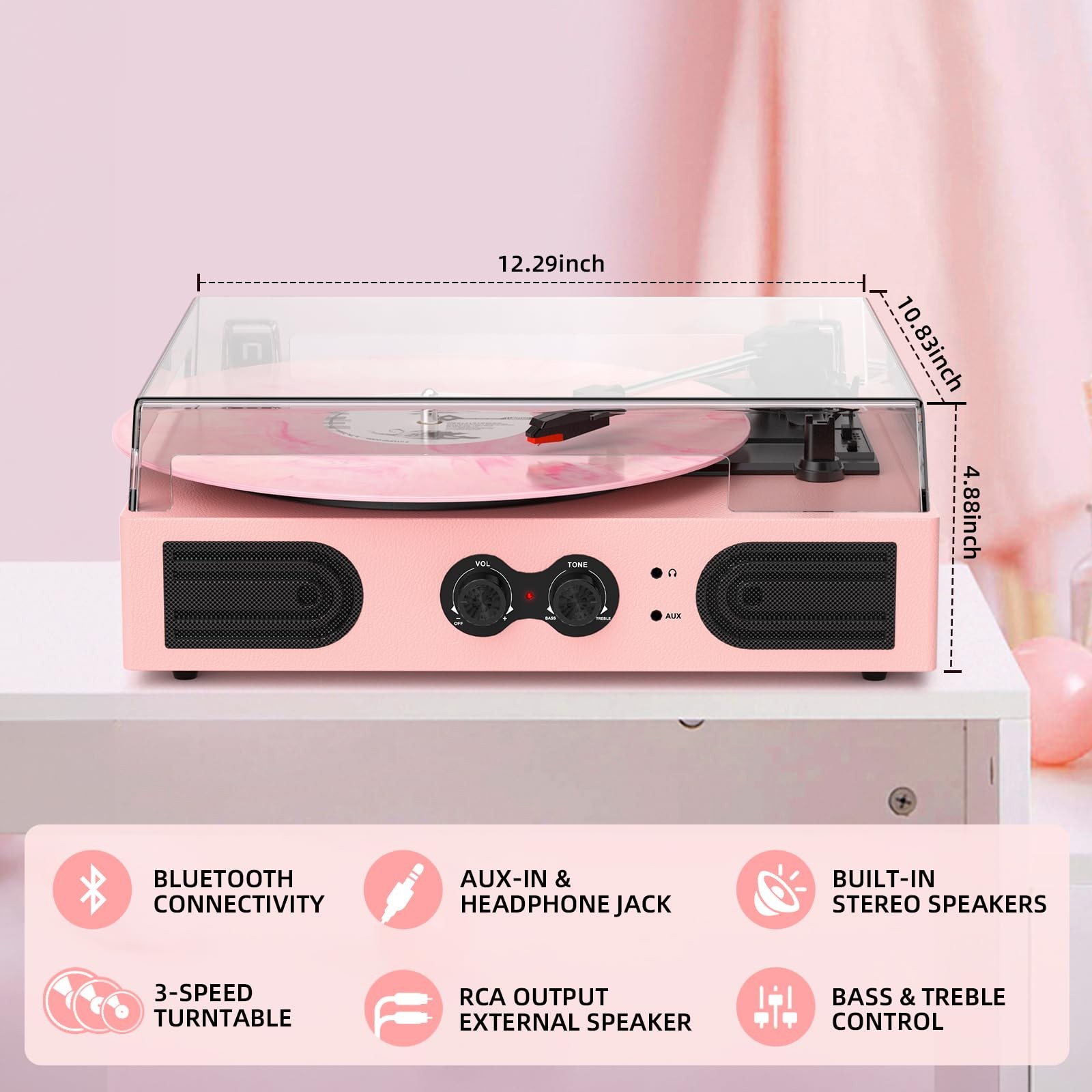 Vinyl Record Player 3 Speed Treble Bass Control Pink Built-in Speakers