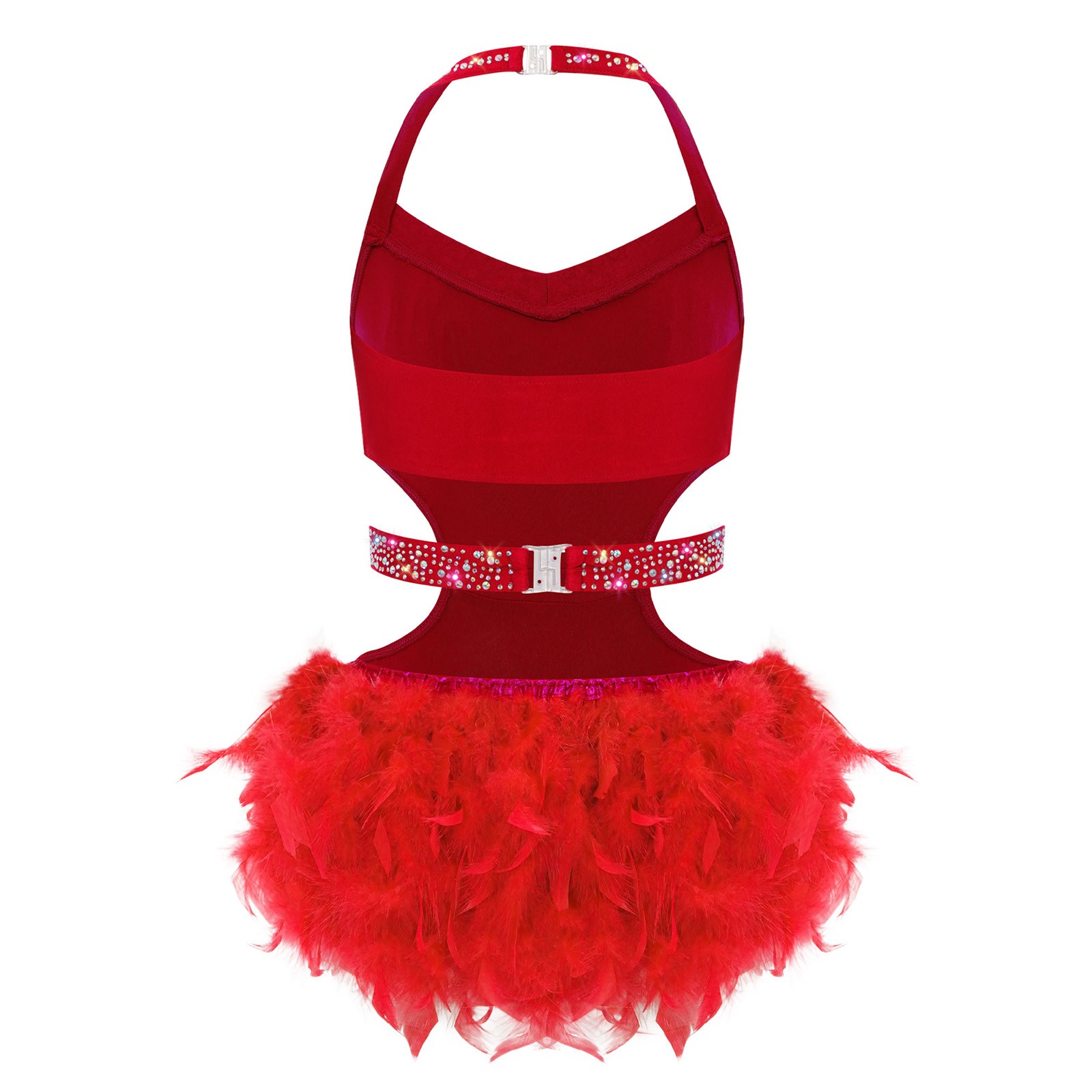 US Girls Feather Tutu Skirt Leotards Rhinestone Latin Dance Unitard Jazz Costume
