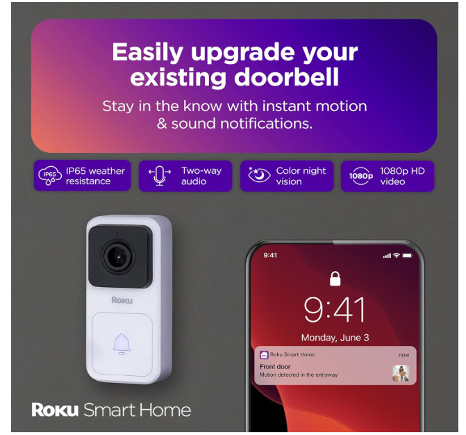 Roku Wire-Free Video Doorbell Chime SE Battery or Wired Smart Doorbell