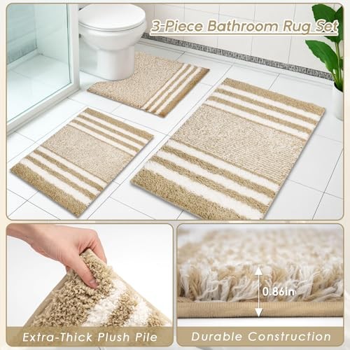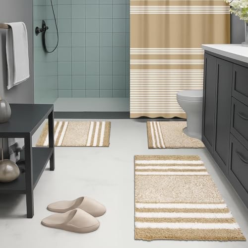 Beige Stripes Bathroom Sets with Shower Curtain and Rugs, Minimalist Beige 4
