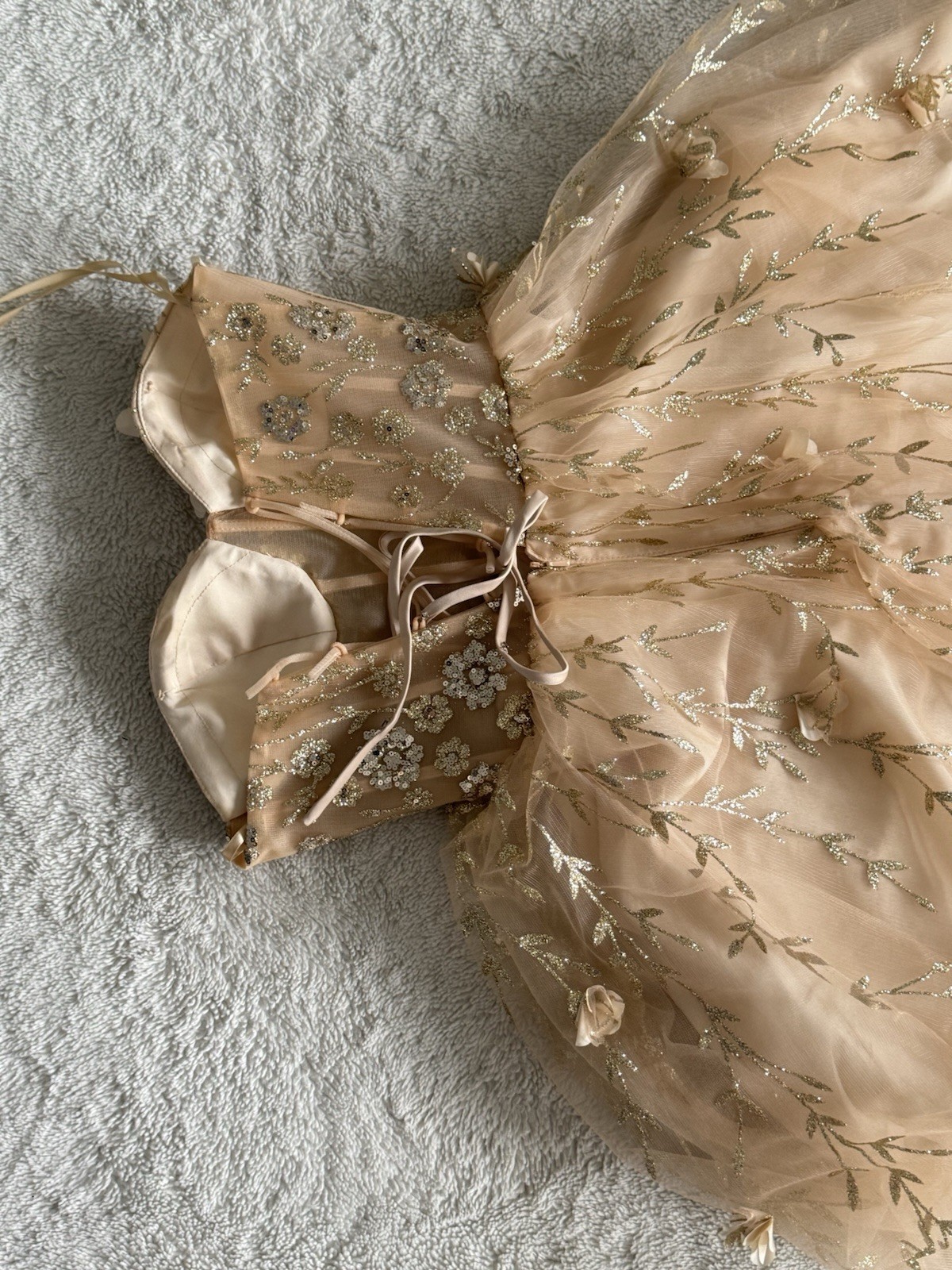 как выглядит Girls Beige Gold Floral Tulle Dress Sleeveless Lace Beaded Formal фото