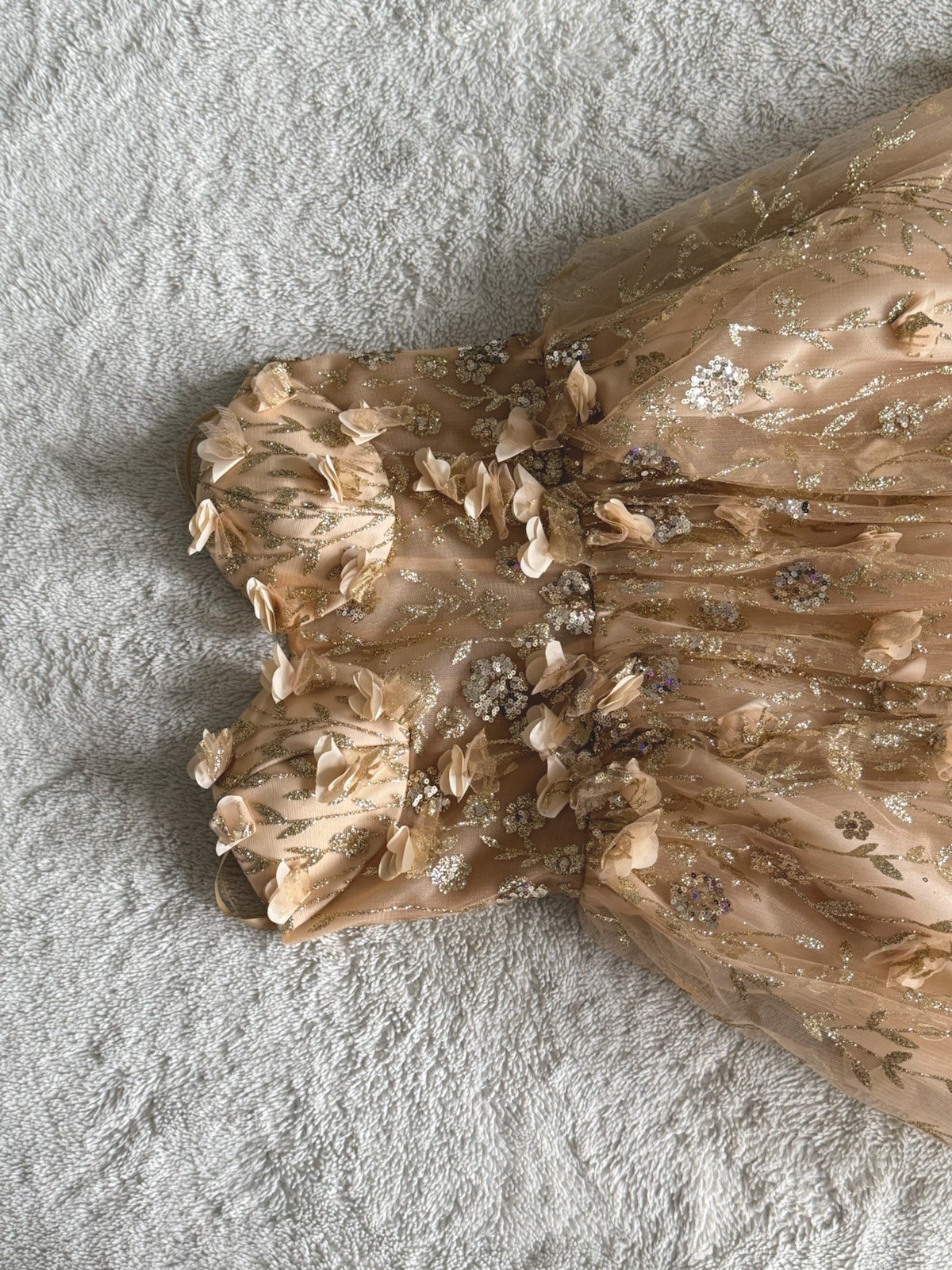 Girls Beige Gold Floral Tulle Dress Sleeveless Lace Beaded Formal