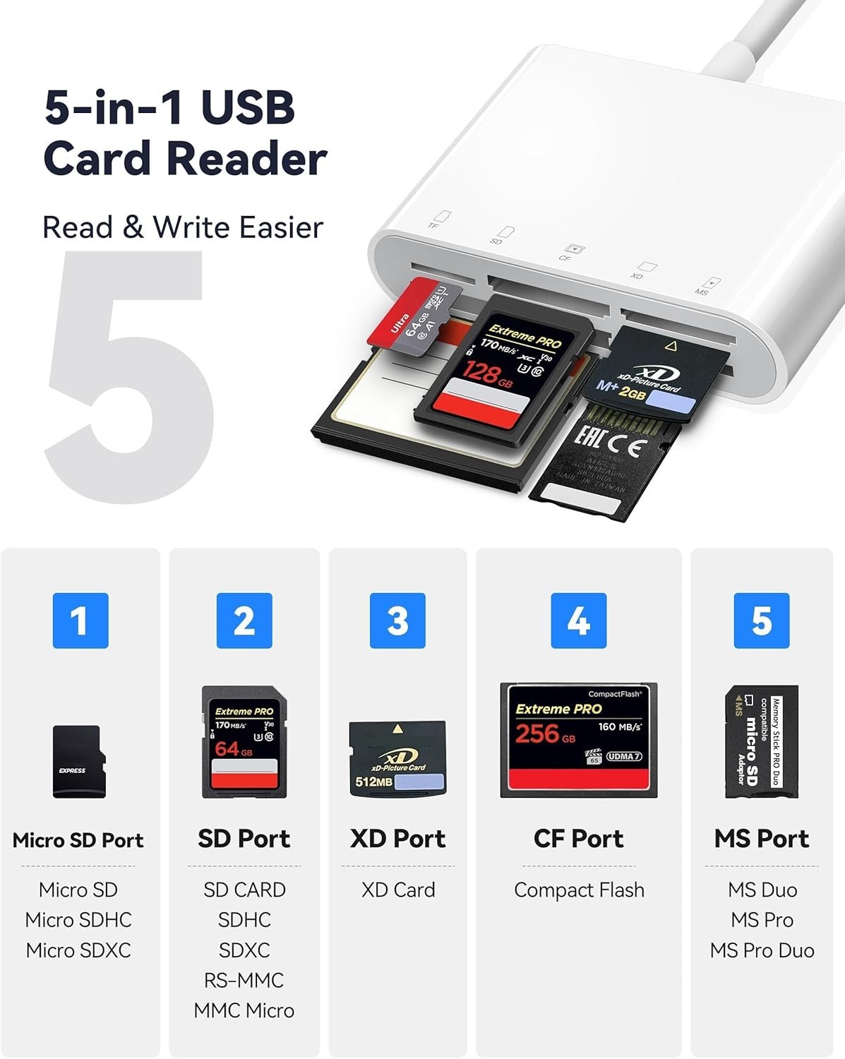 Memory Card(s) Supported: SD, SDHC, SDXC, Micro SD, MicroSDHC, microSDXC, MMC, RS-MMC, CompactFlash I, CompactFlash II, Memory Stick, Memory Stick Duo, Memory Stick PRO, Memory Stick PRO Duo, Memory Stick PRO-HG Duo, XD, P2, SmartMedia, SxS