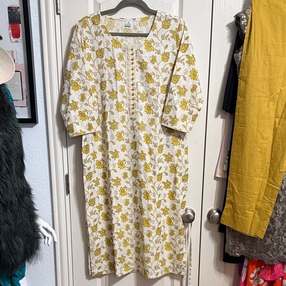 как выглядит Yellow Floral Kurta Matching Set Pants Bollywood Ethnic Wear Indian Boho Kurti фото
