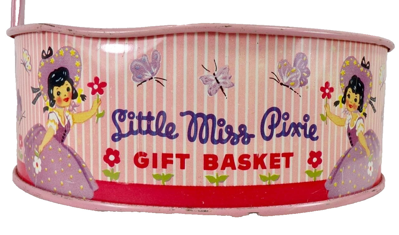 Little Miss Pixie Basket Gift Tin Easter Pink Girls in Purple Dresses 1950s