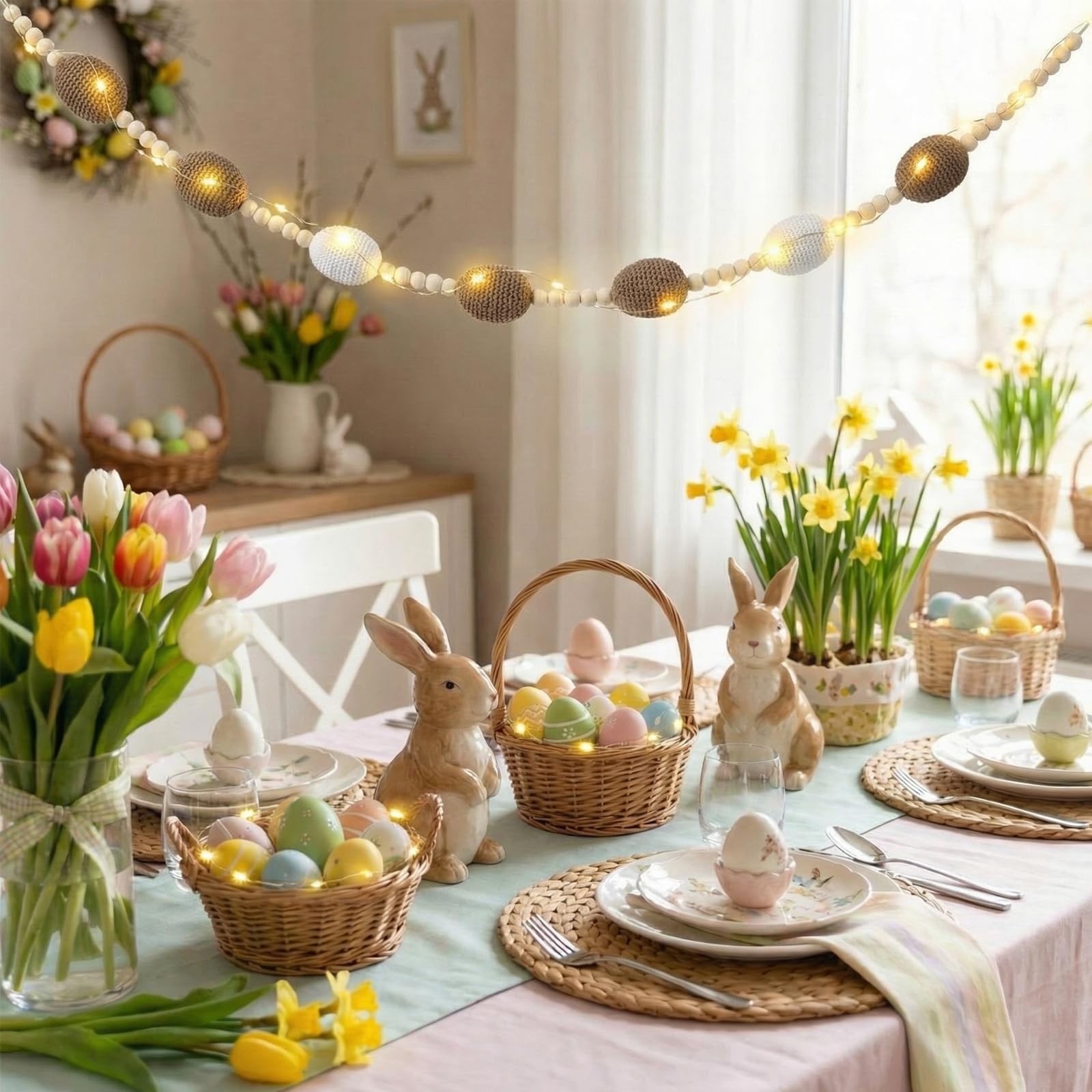 6.56 ft Easter Egg Garland Wooden Beads Easter Garland with String Lights Linen