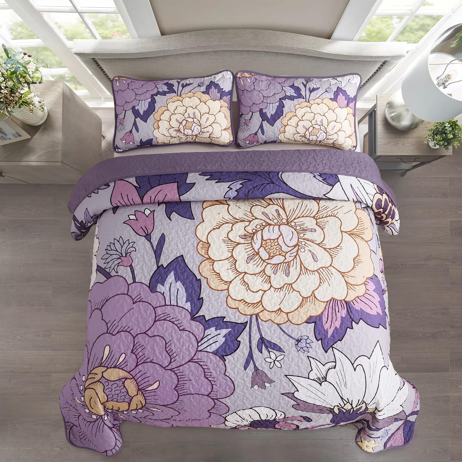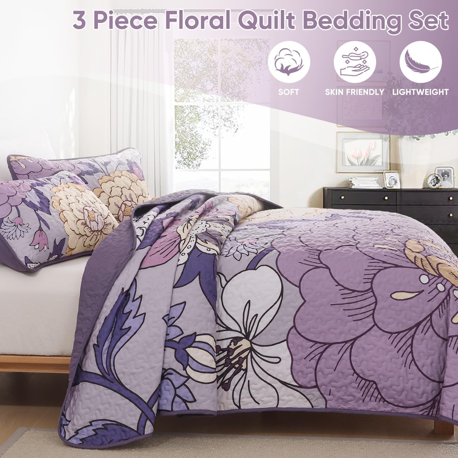 Floral Quilt Set King Size Purple Boho Bedspread Coverlet Set, 3 Piece Microf...